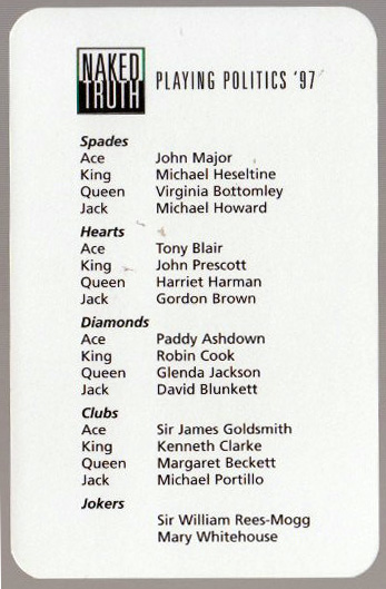 Above: “Naked Truth” Playing Politics playing cards with caricatures by Jason Pratt, published by InterCol, London, 1997. Images courtesy Rex Pitts.