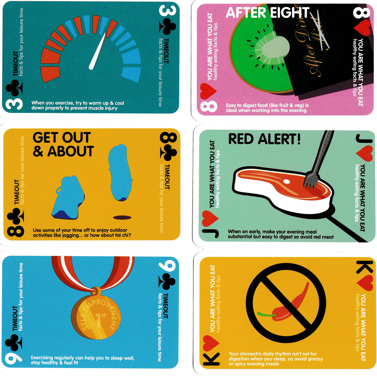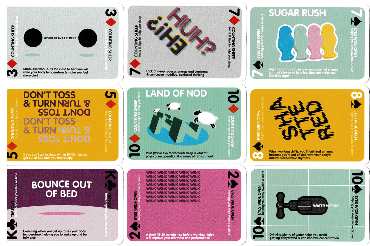Each suit concentrates on a particular aspect: Eyes wide open: helping you stay awake at night (spades); Counting sheep: facts and tips to help you sleep (diamonds); Timeout: facts and tips for your leisure time (clubs); You are what you eat: healthy eating facts and tips (hearts). The cards are larger than average (10 cm x 6.5 cm), and include 2 jokers and 2 extra cards which explain their rationale►