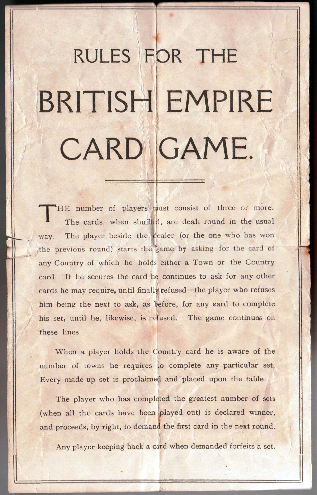 The British Empire antique card game published by Norvic Mill, c.1920. In the 16th century Britain began to establish overseas colonies. The Empire went through many changes during the course of history and interpretations have changed over time, including reviewing some of the more shameful aspects. The object of this game is to win the most complete sets of cards for each country. See the Rules►