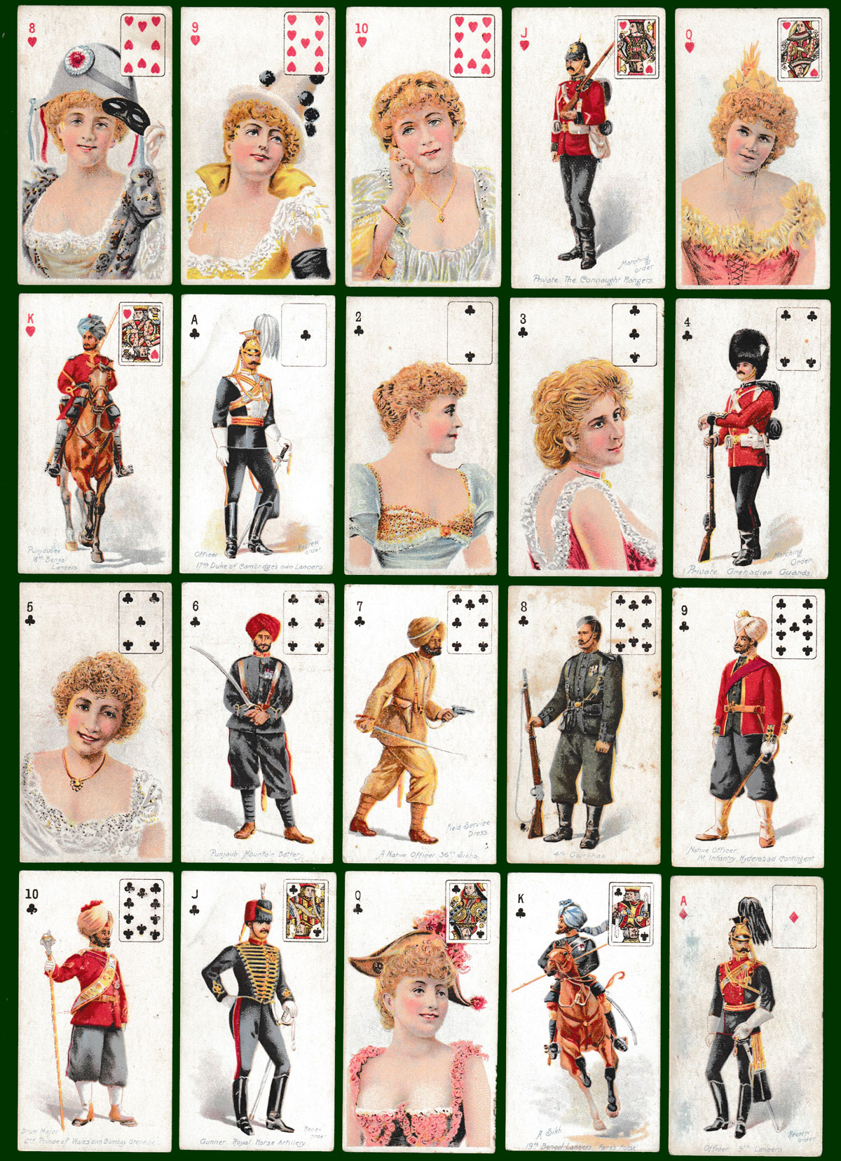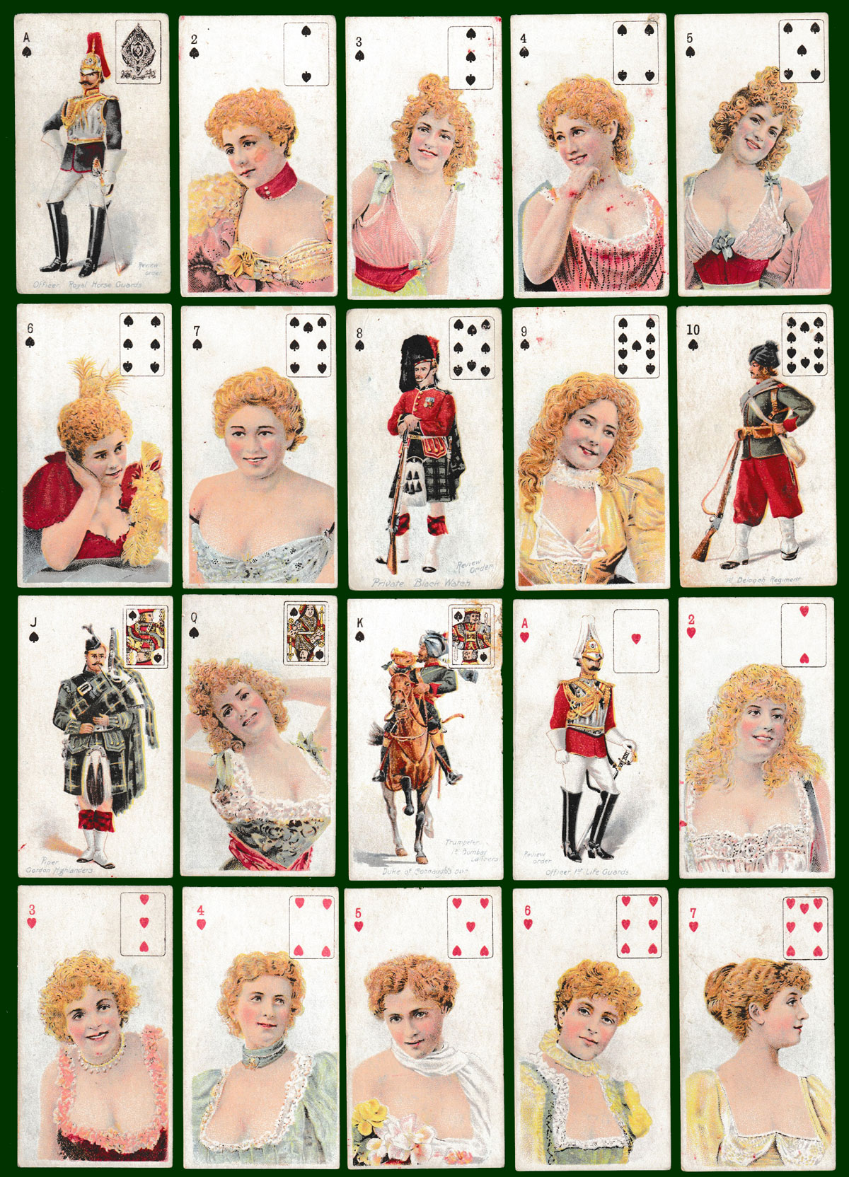 Cigarette cards featuring beauties and military uniforms with playing-card insets.