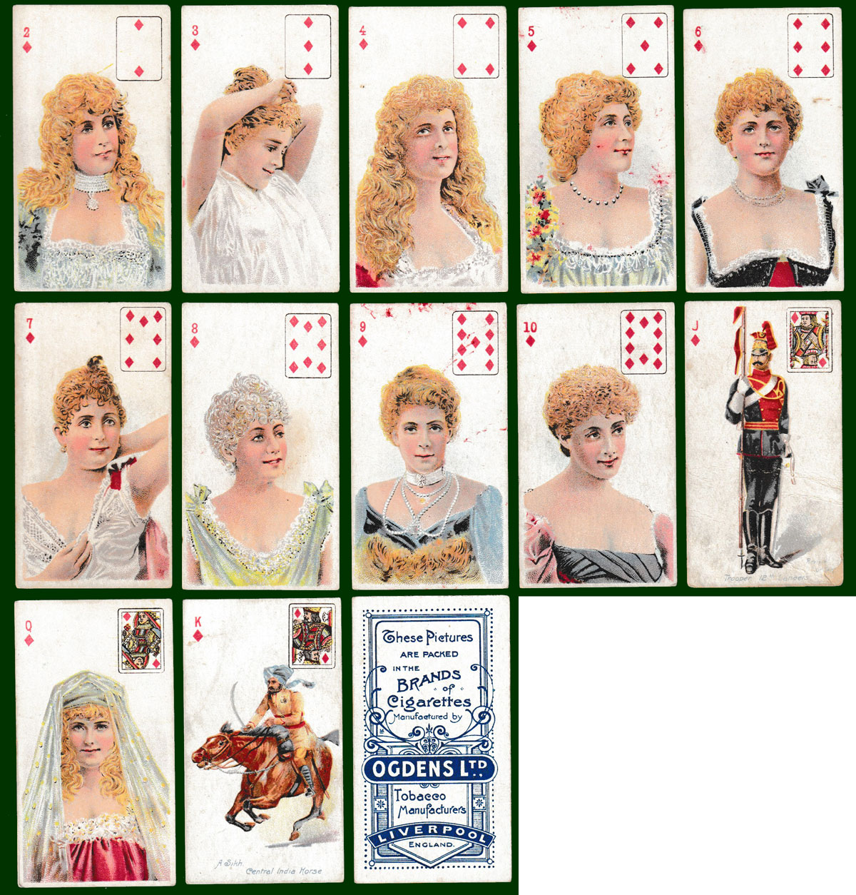 For a collector of cigarette cards, this is one of the rarest sets in existence. It features an odd mixture of military uniforms (20 cards) and beauties (32 cards). For a playing-card collector, the interest lies in the miniature playing-card inset included top right on every card, particularly the Ace of Spades which is clearly modelled on a Goodall ace. Ogdens did issue other sets of cigarette cards with playing-card insets but this set is the earliest (1898). The back naturally features an advertisement for Ogdens, tobacco manufacturers of Liverpool, England.