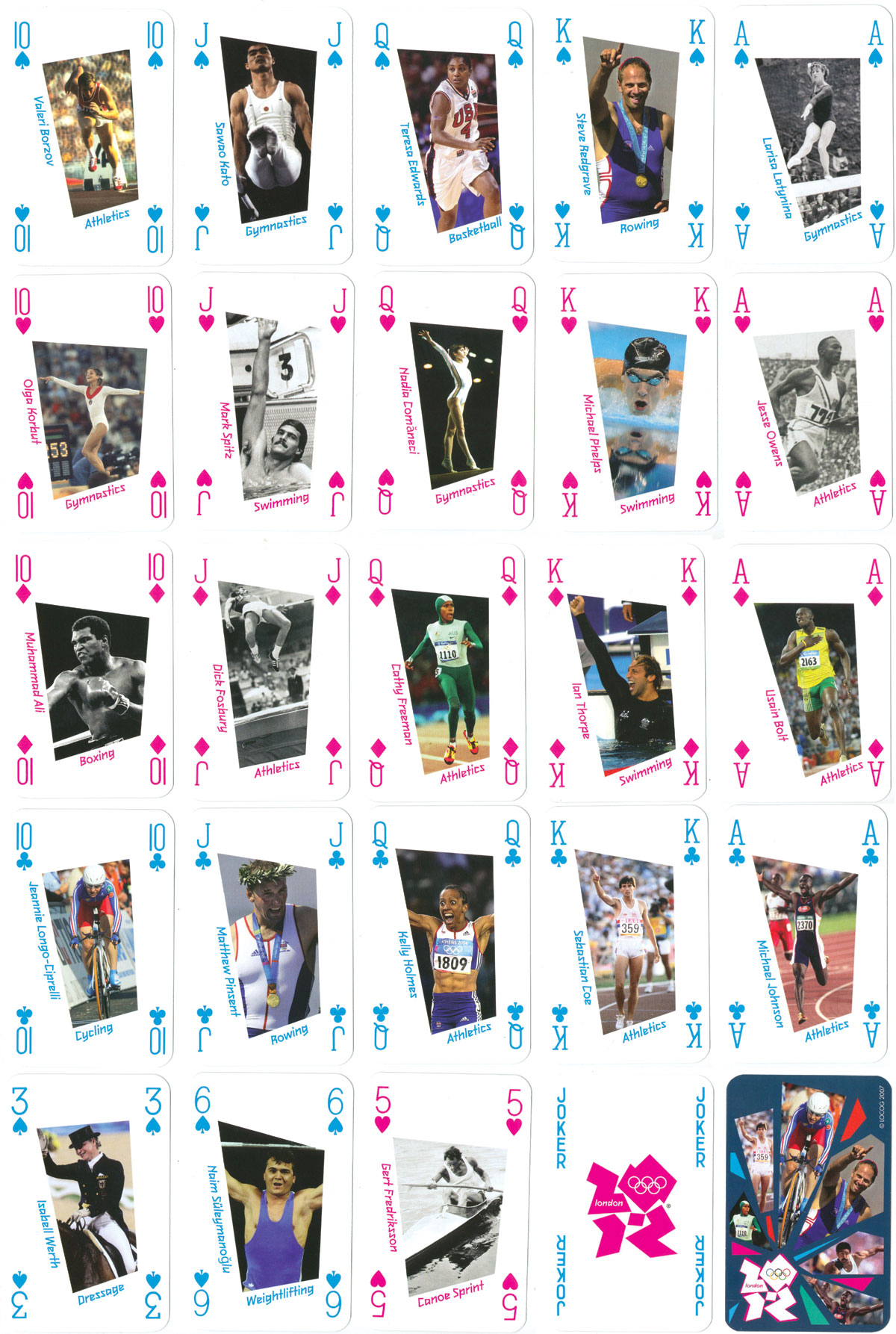 London 2012 Olympic Legends was a deck of cards produced as part of a series of 'Official Products of London 2012' by Winning Moves under license from LOCOG. The deck features 52 different photos of 'Olympic Legends' in various disciplines through the ages, including such names as Mark Spitz, Muhammad Ali, Steve Redgrave, Jesse Owens, Olga Korbut, Nadia Comaneci, Michael Johnson, Daley Thompson etc. The irregular quadrilateral shapes of the images adds a sense of athletic energy and dynamism to the non-standard and modern designs, with unusual colouring.