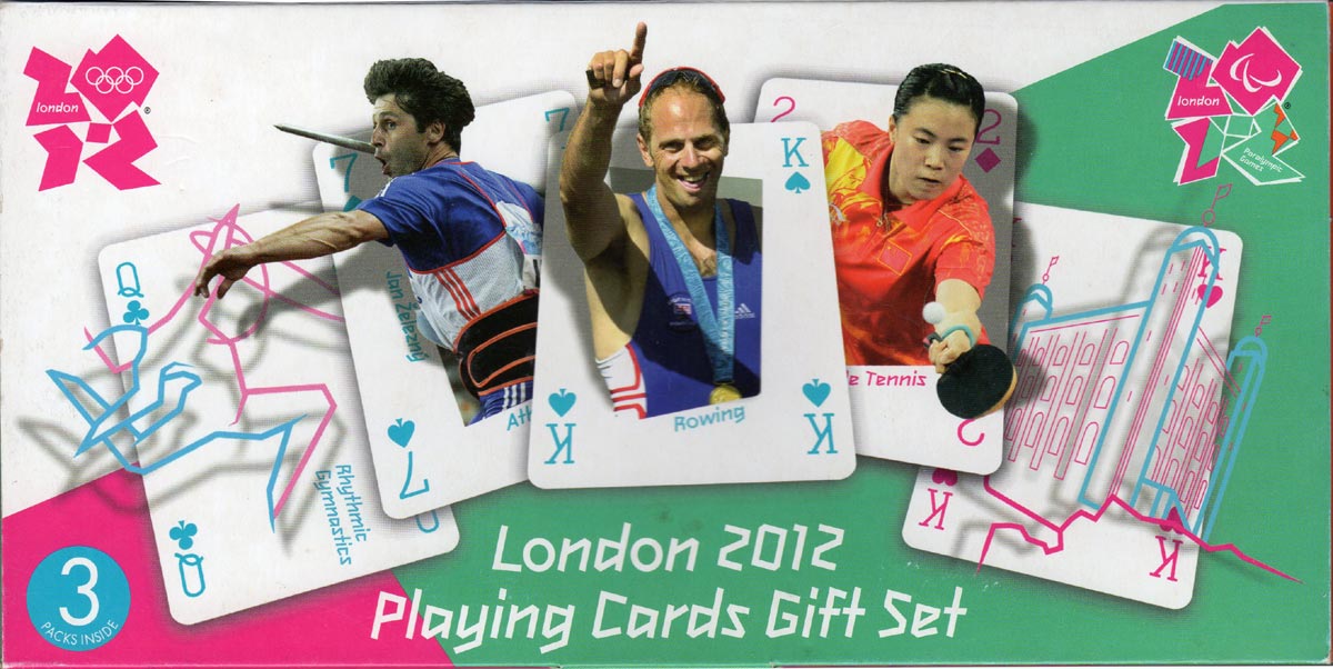 Three complimentary sets were being produced by Winning Moves in the UK. Besides "Olympic Legends" were "London 2012 Sports" with abstract bi-colour drawings of sports featured at the event and "London Landmarks" with abstract bi-colour drawings depicting landmarks of London. The three packs were sold separately and as a three-pack boxed "London 2012 Playing Cards Gift Set".