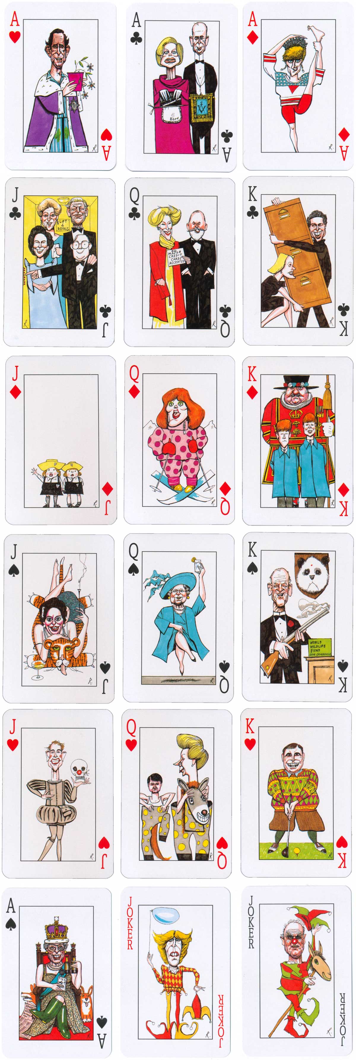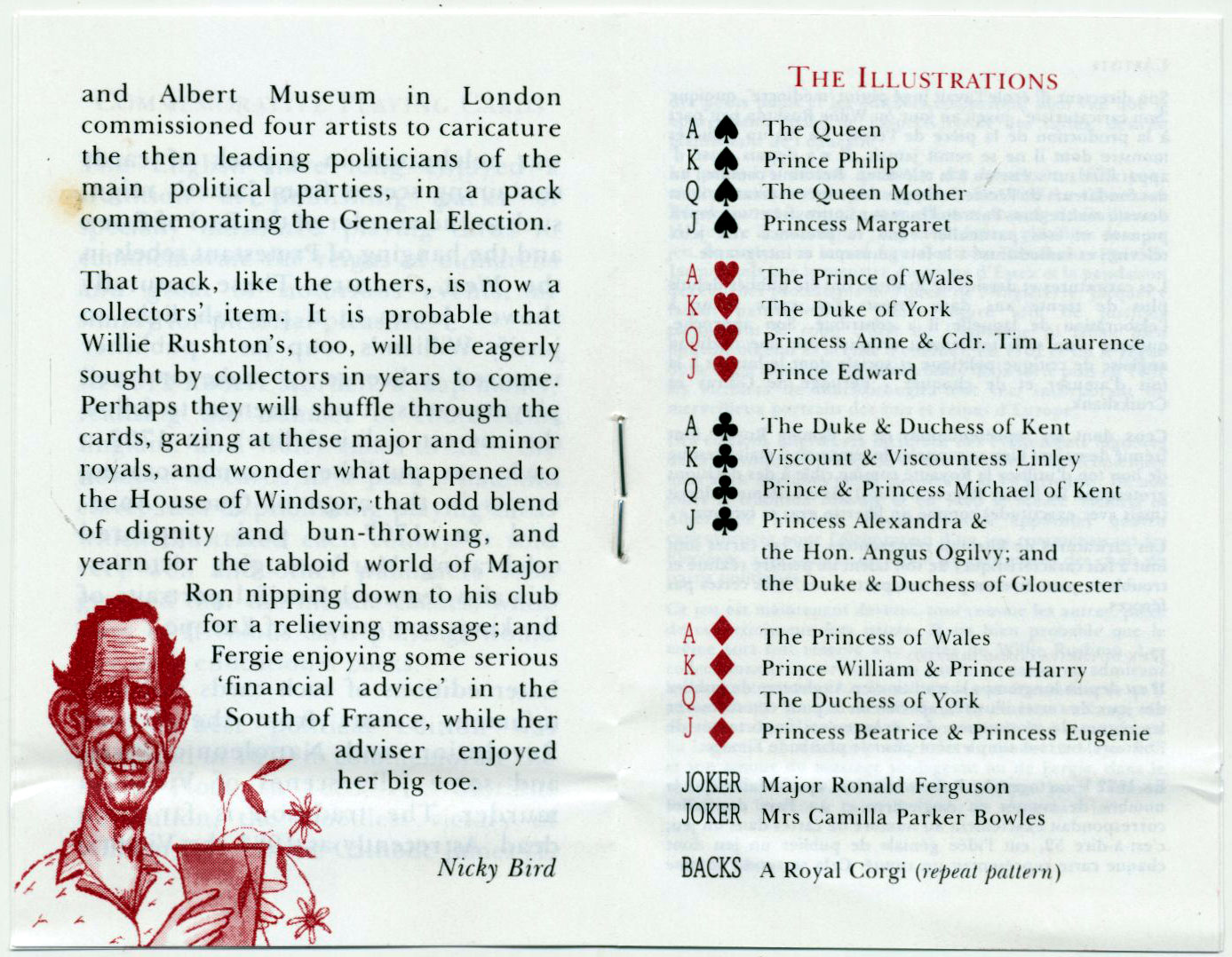 Willie Rushton’s “Pack of Royals” features caricatures of the Royal Family, 1995. Each ace, court card and joker carries a caricature of a different member of the Royal Family drawn by Willie Rushton. See the List of Illustrations►