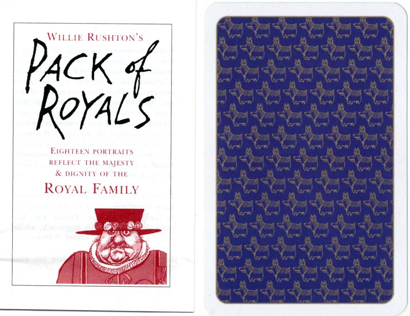 Above: Willie Rushton’s “Pack of Royals”, published by Antony Bird and printed by Piatnik, 1995. Packs contain 52 cards + two jokers + a bridge score card (extra joker) and an information booklet printed in English, French and German, in order to make the pack more saleable elsewhere.