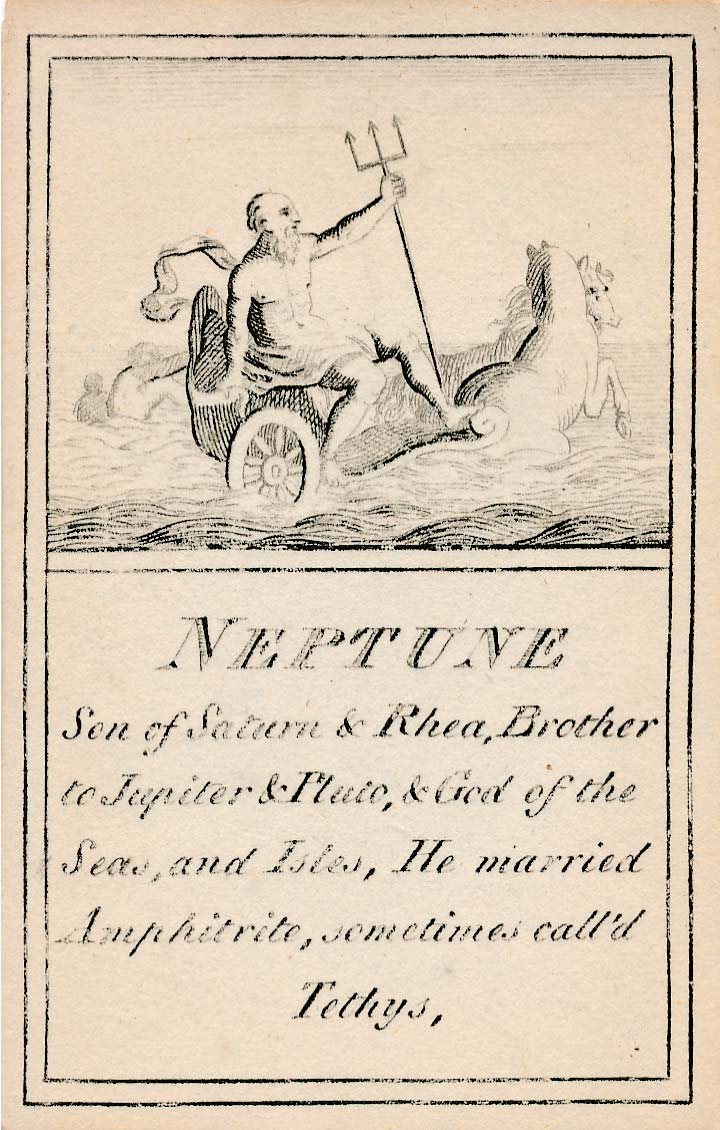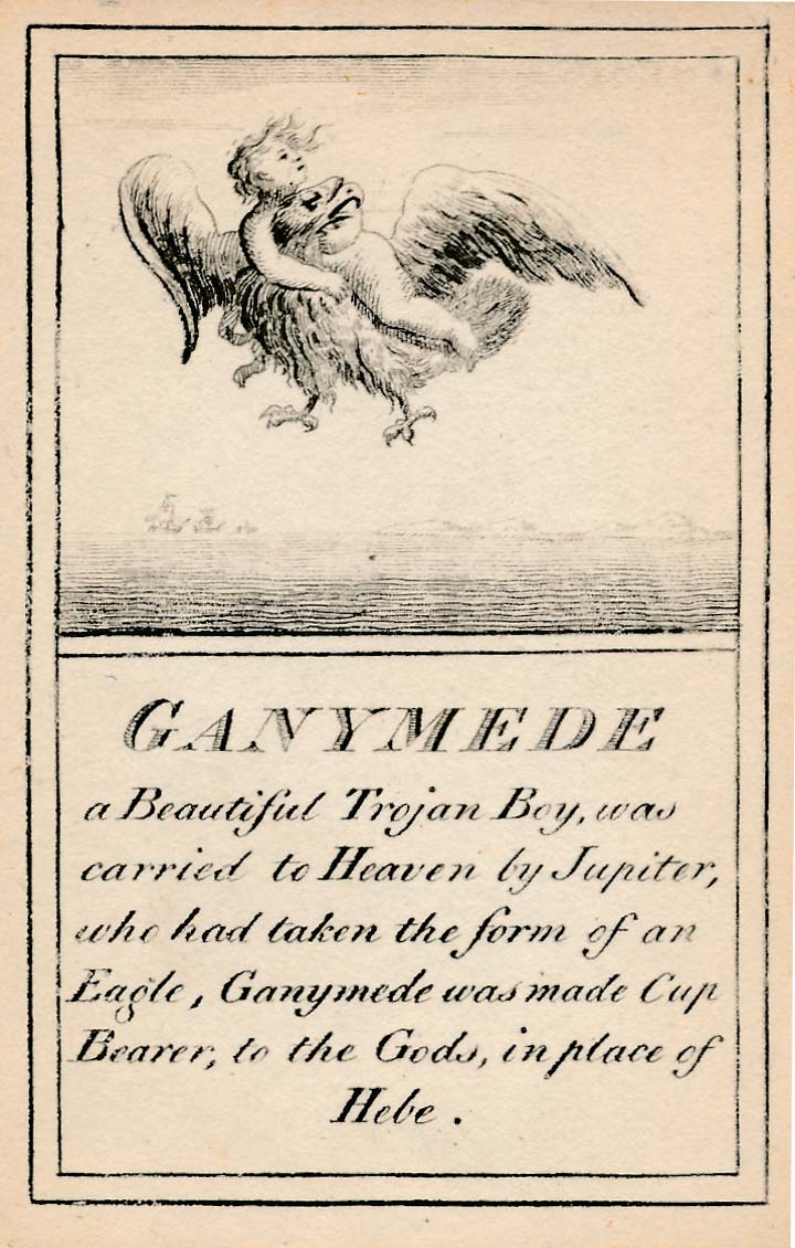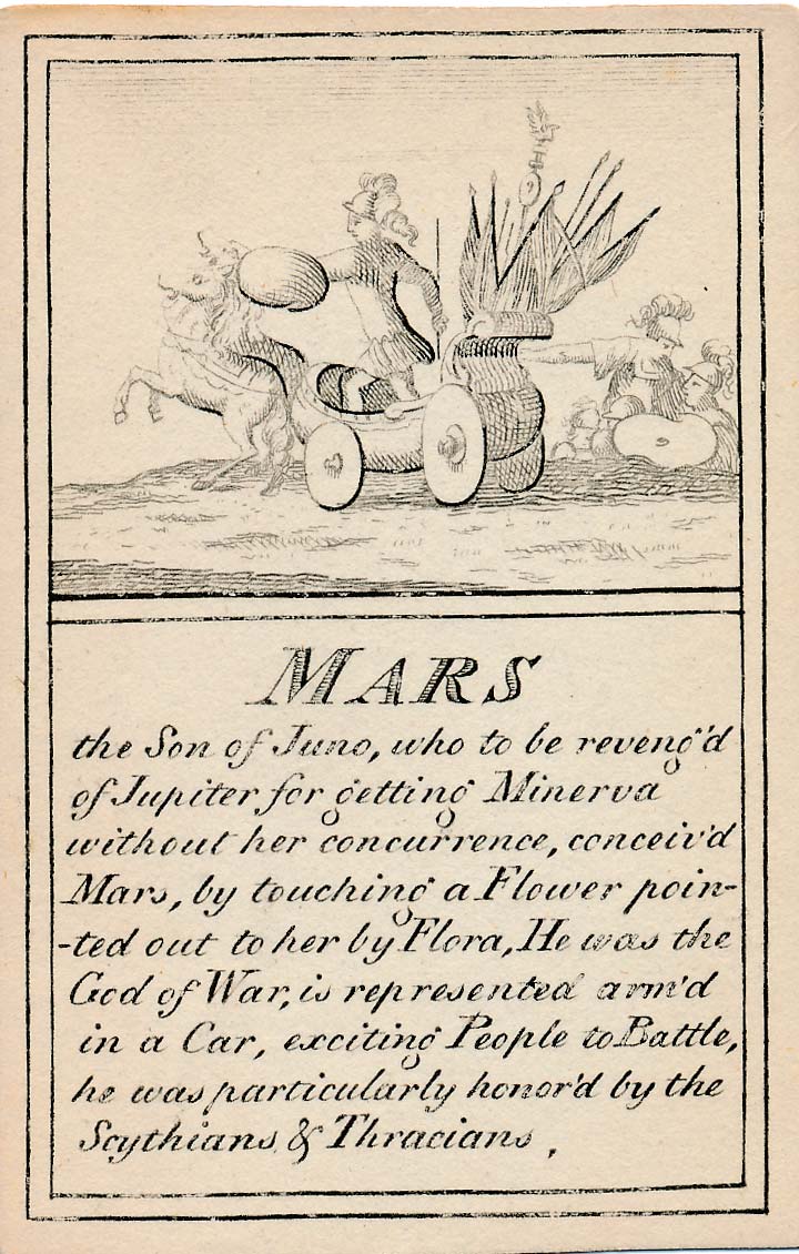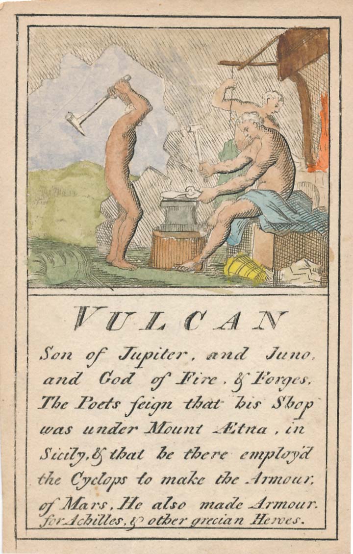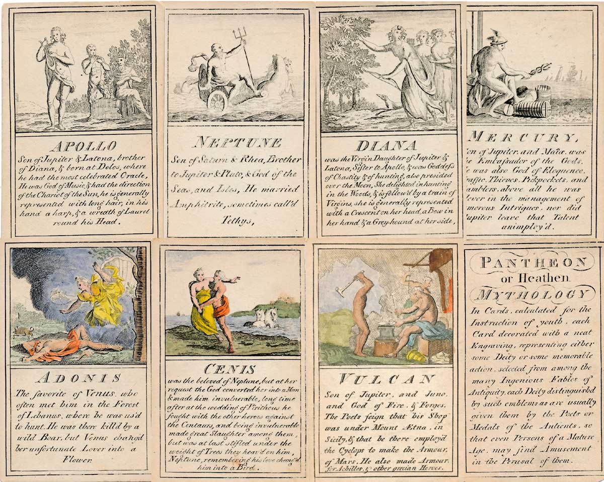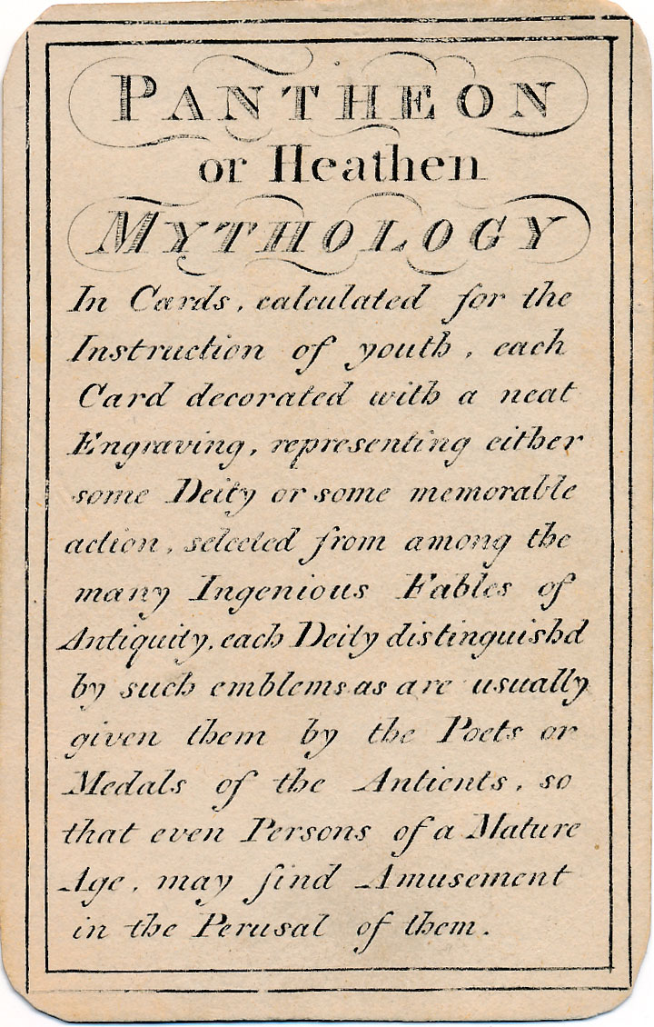 Pantheon or “Heathen Mythology” pictorial cards introduce players to ancient Greek and Roman mythology, without which a classical education would be incomplete, and were designed for personal perusal and the instruction of youth in around 1770. A complete set contains 52 instruction cards plus an extra pictorial card showing Mount Olympus and a title card►