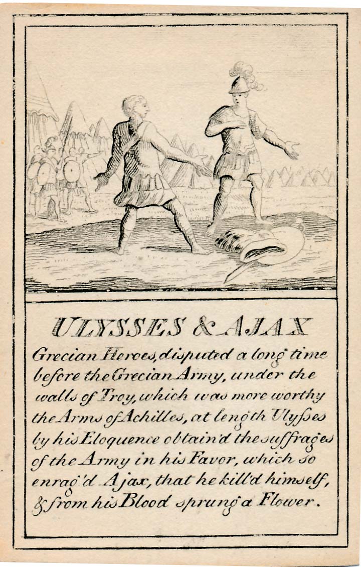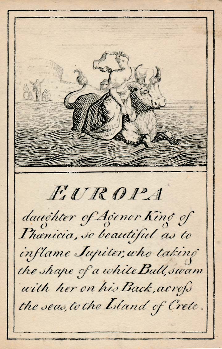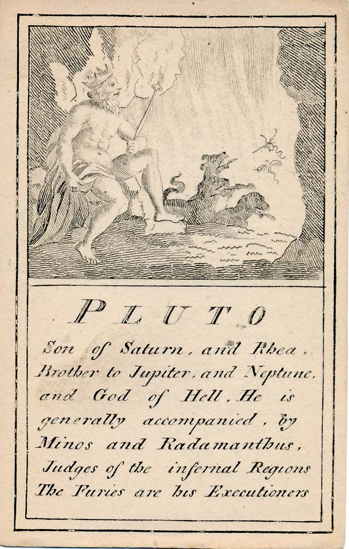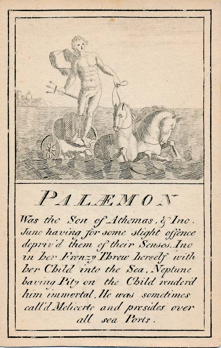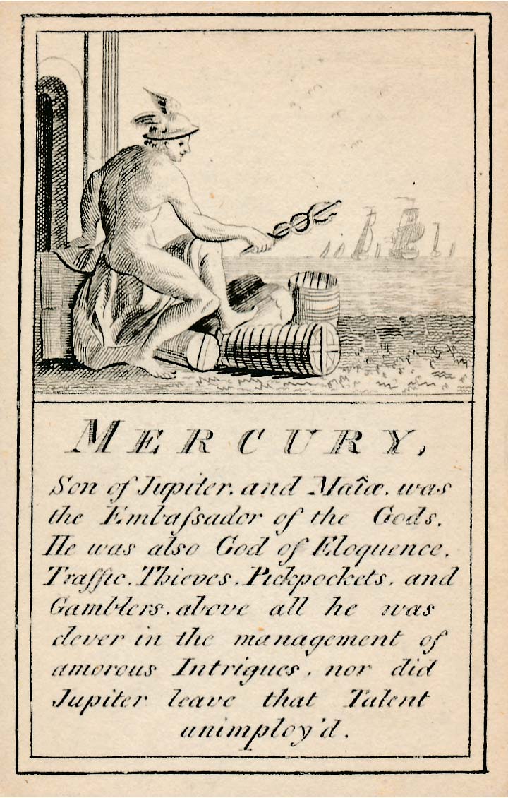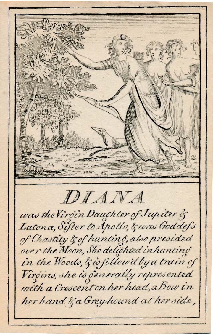 Pantheon or “Heathen Mythology” pictorial cards introduce players to ancient Greek and Roman mythology, without which a classical education would be incomplete, and were designed for personal perusal and the instruction of youth in around 1770. A complete set contains 52 instruction cards plus an extra pictorial card showing Mount Olympus and a title card►
