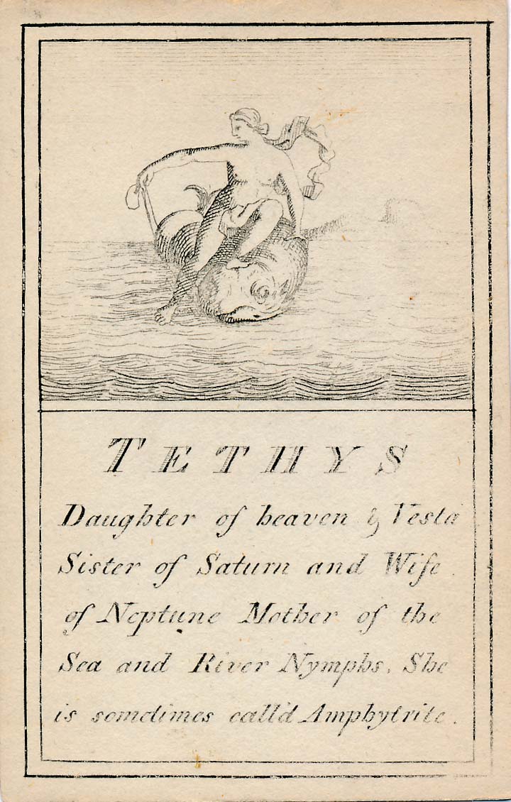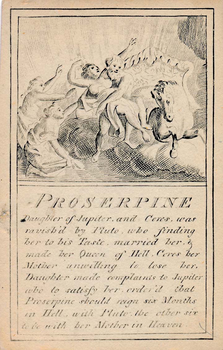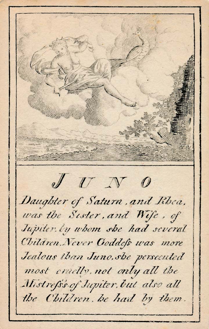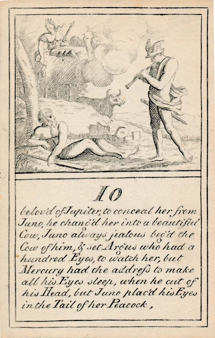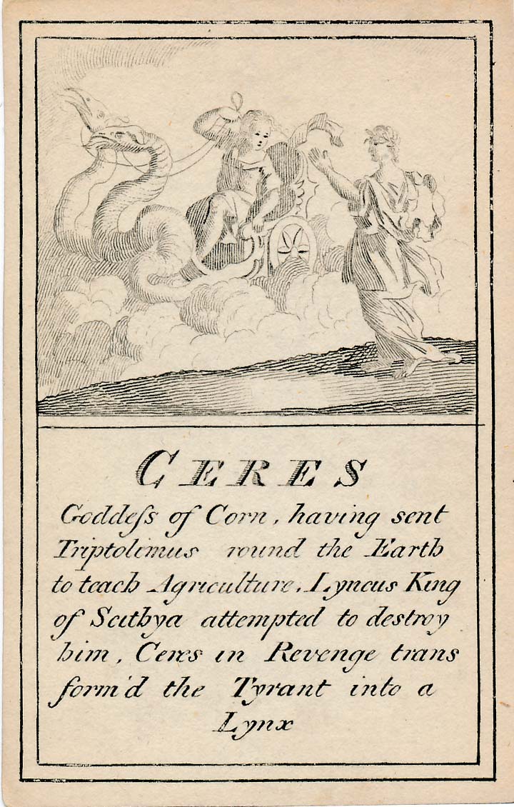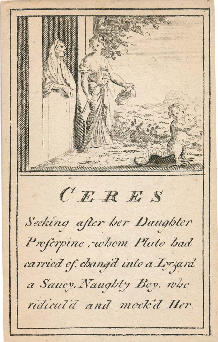 In those days interest in the history of ancient gods and classical mythology was inspired by emerging studies in archaeology, genealogy and other forms of antiquarianism. But these “Pantheon” cards were designed for amusement and sold at Willerton’s Toy Shop, London, c.1770. Interestingly there are two cards for two characters (Ceries and Iphis) both different, referring to different incidents.