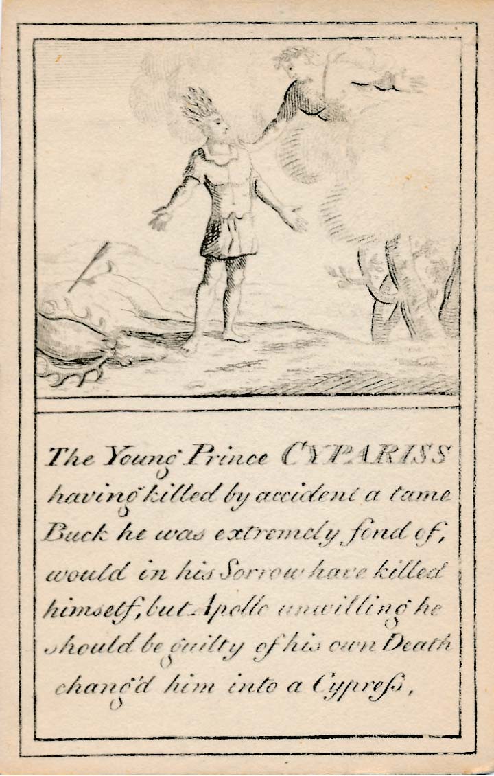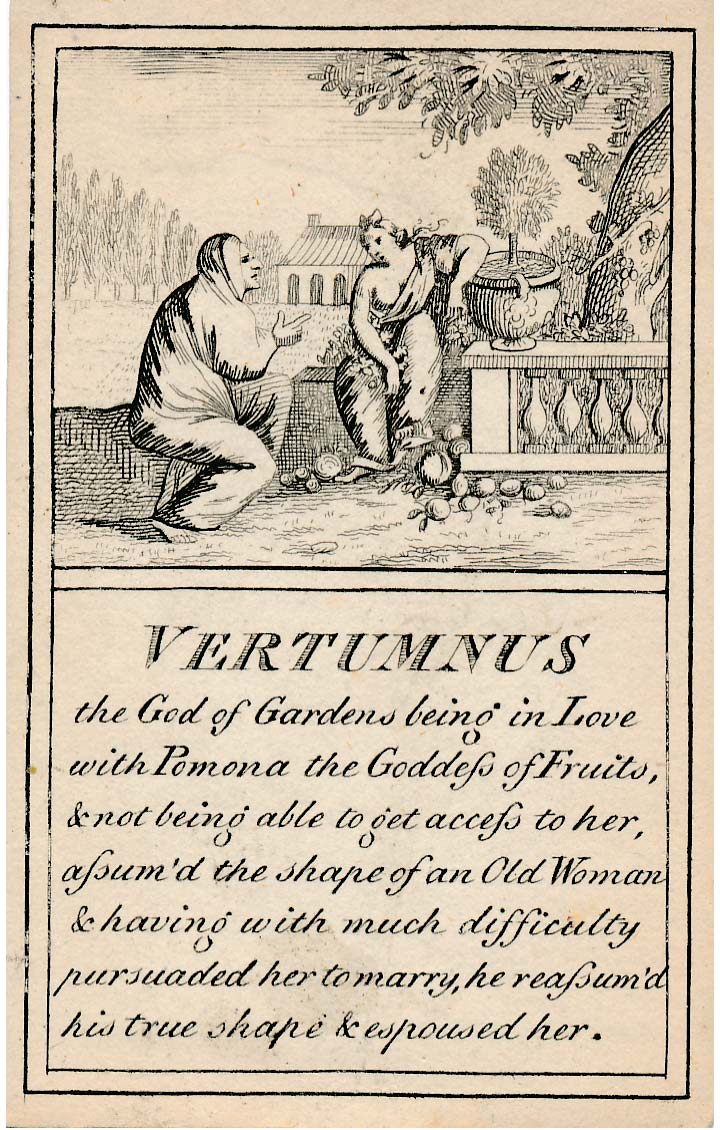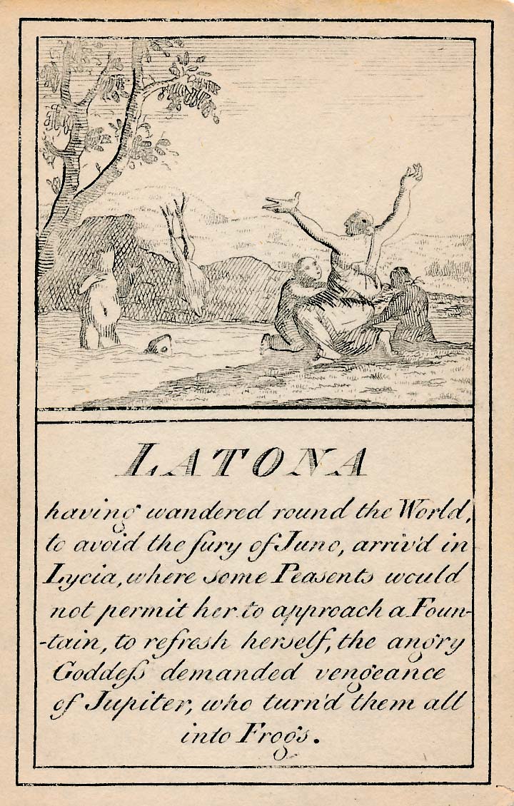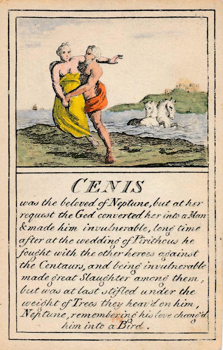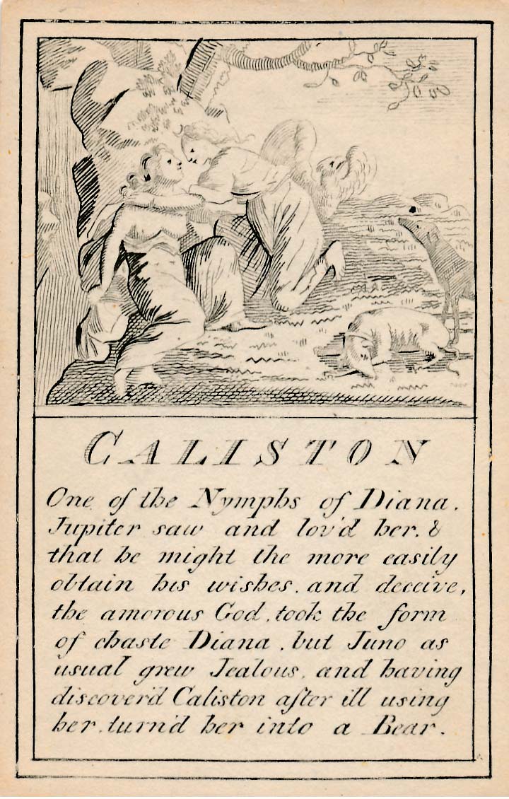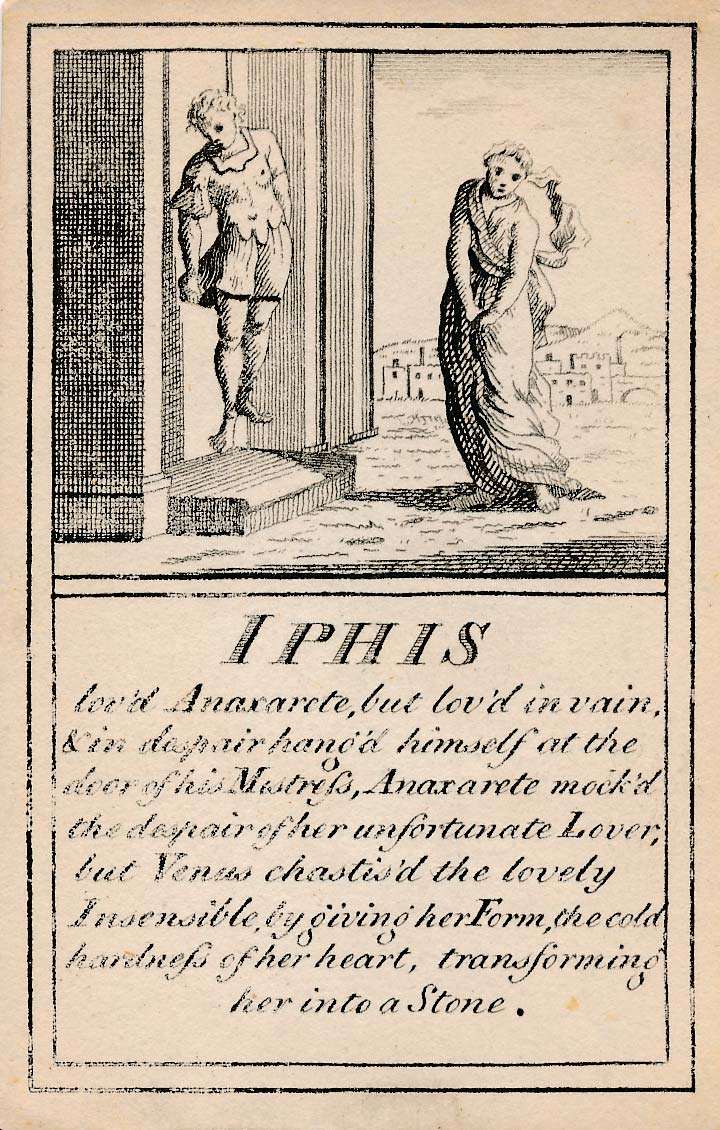 In those days interest in the history of ancient gods and classical mythology was inspired by emerging studies in archaeology, genealogy and other forms of antiquarianism. But these “Pantheon” cards were designed for amusement and sold at Willerton’s Toy Shop, London, c.1770. Interestingly there are two cards for two characters (Ceries and Iphis) both different, referring to different incidents.