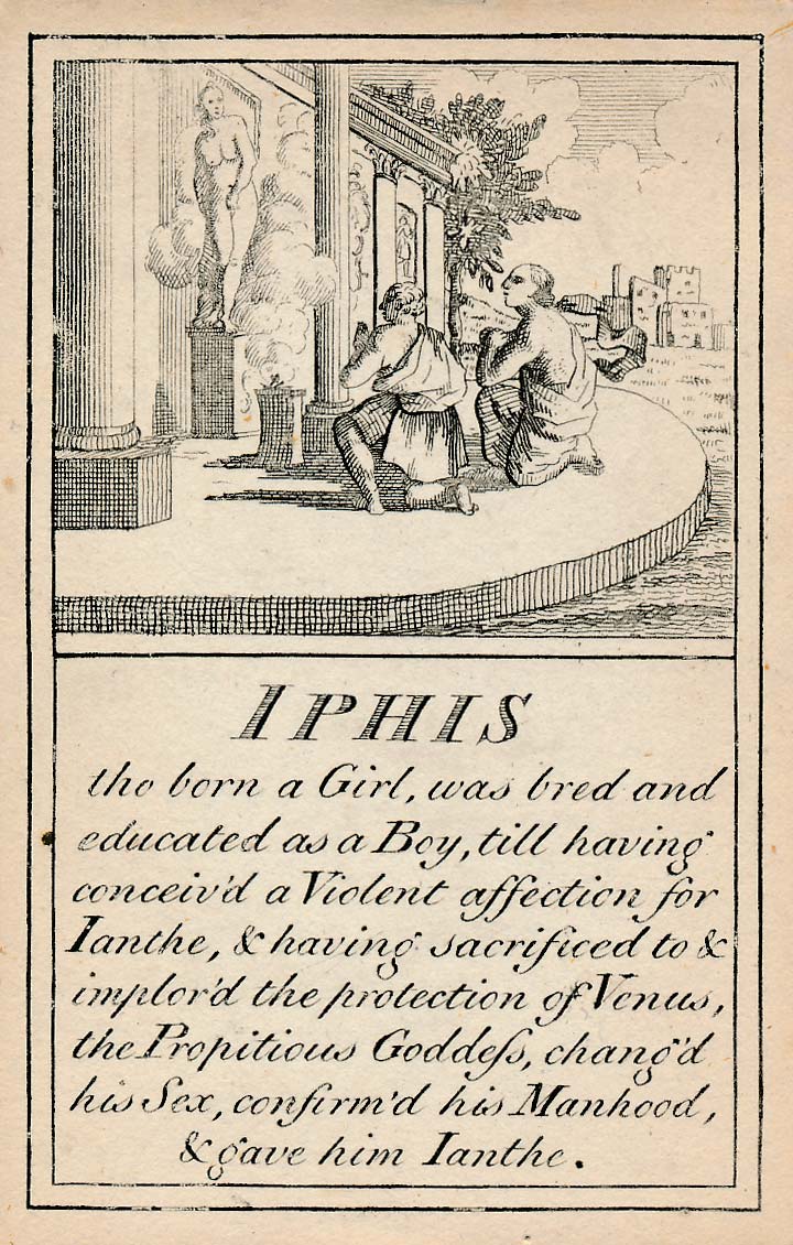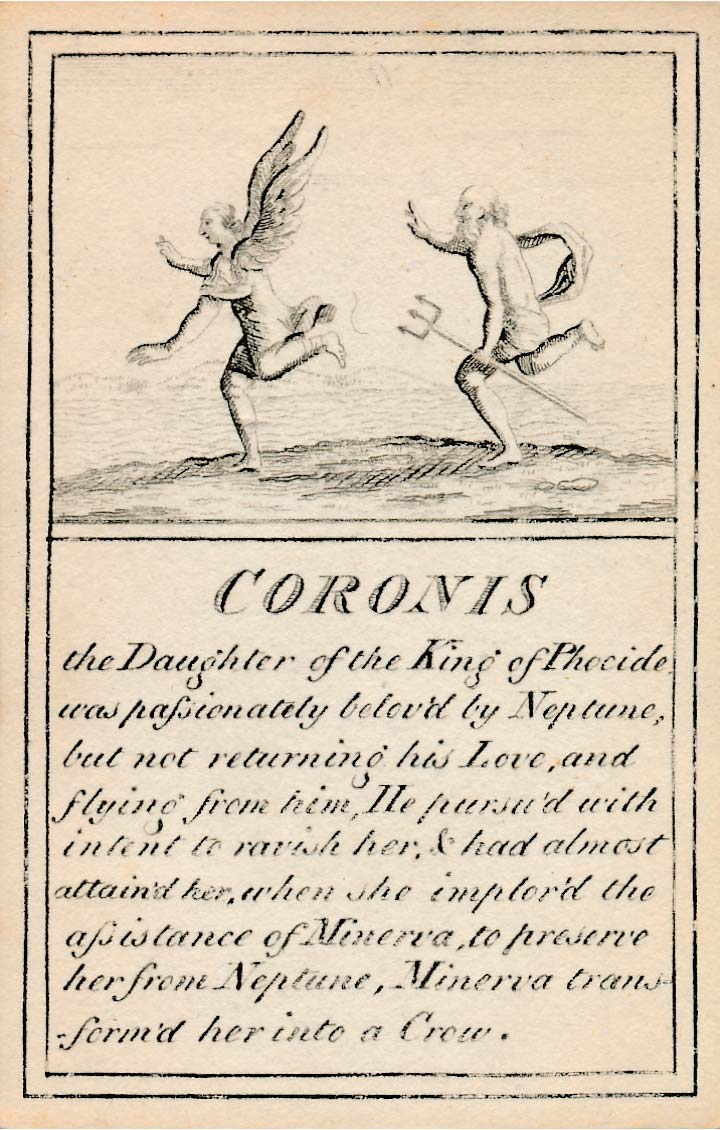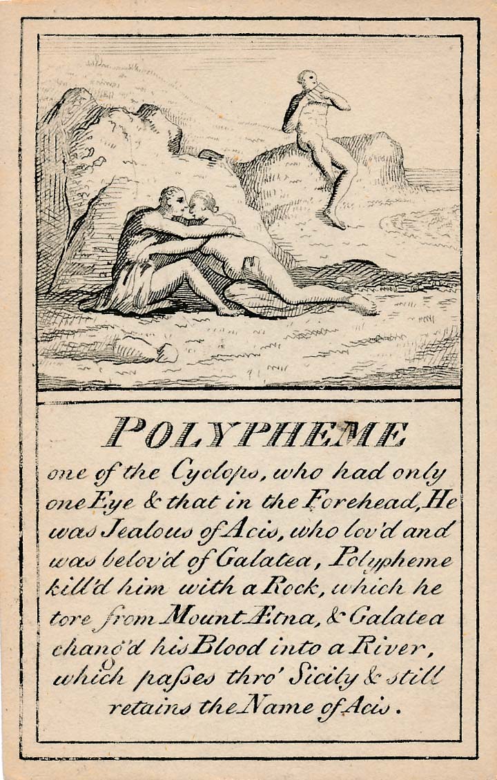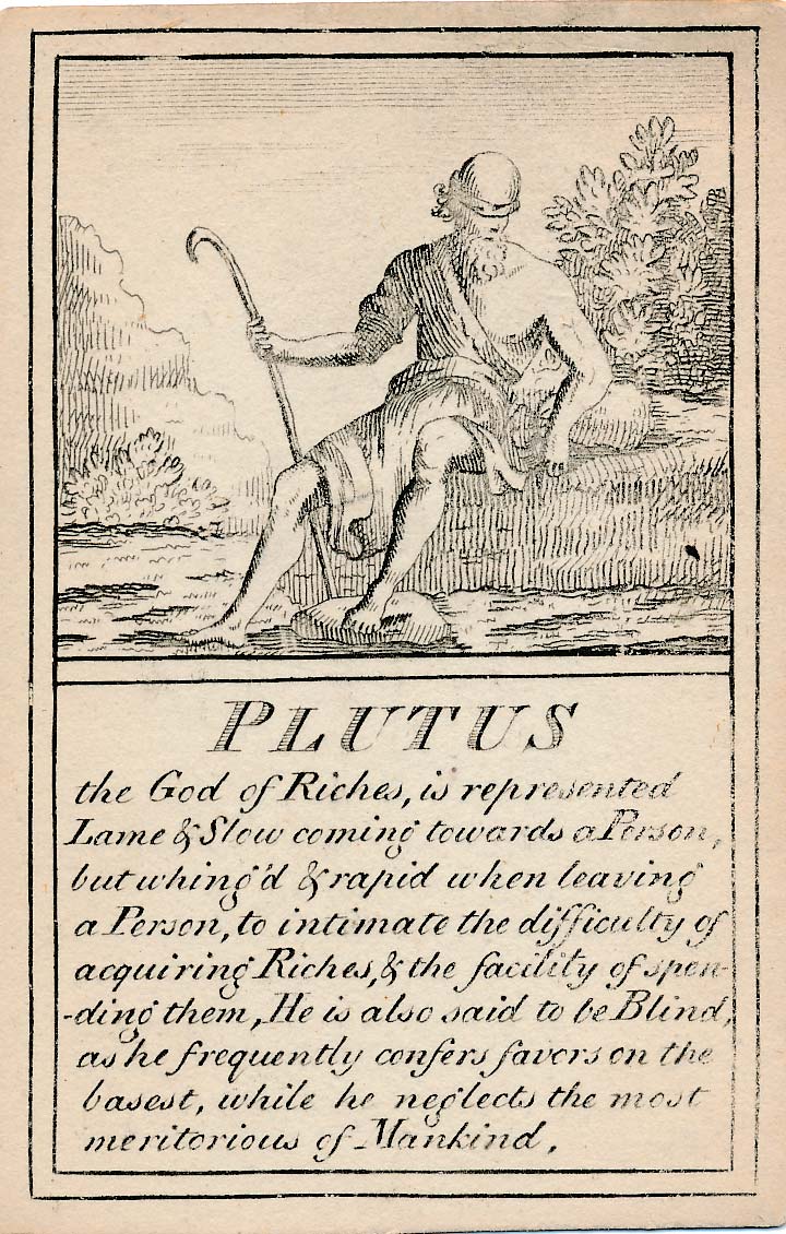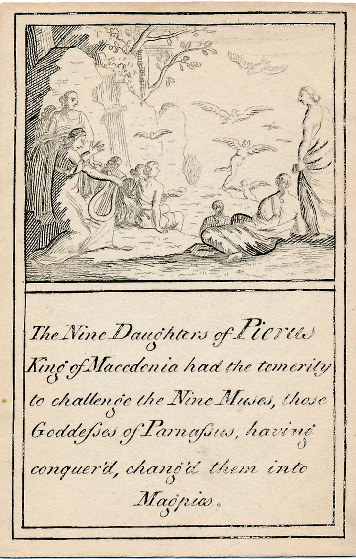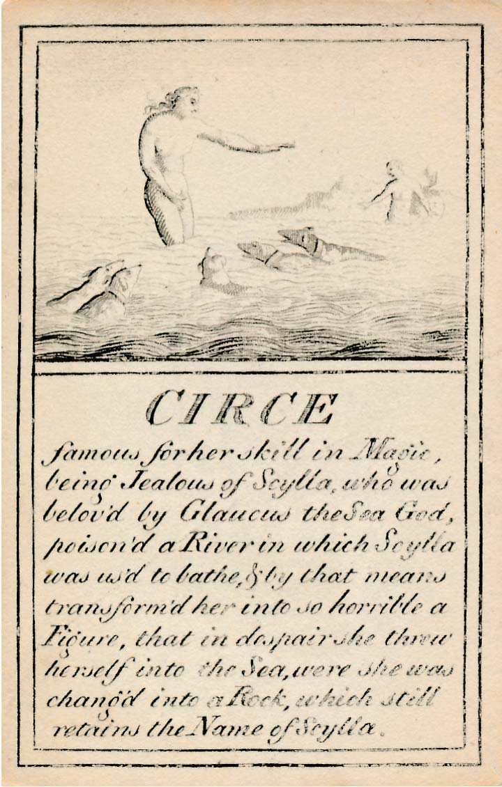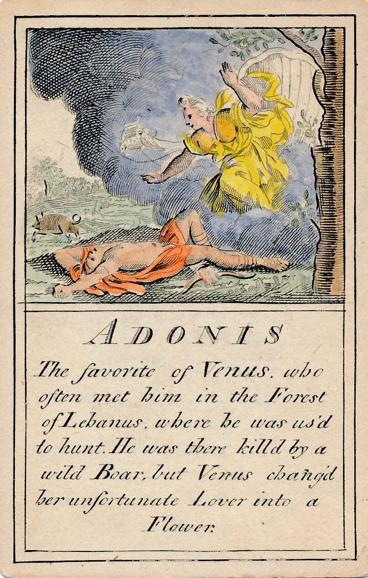 In those days interest in the history of ancient gods and classical mythology was inspired by emerging studies in archaeology, genealogy and other forms of antiquarianism. But these “Pantheon” cards were designed for amusement and sold at Willerton’s Toy Shop, London, c.1770. Interestingly there are two cards for two characters (Ceries and Iphis) both different, referring to different incidents.