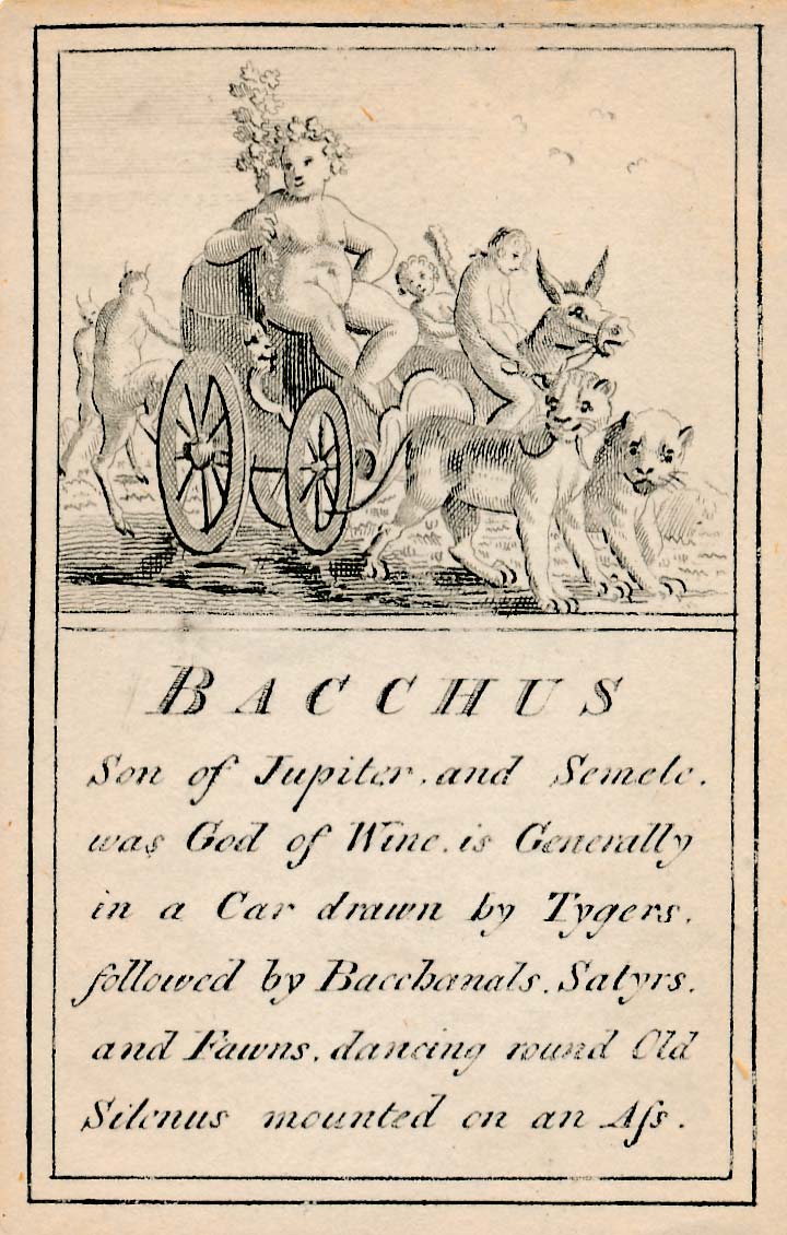 Each card is divided into two halves with double line borders. The top halves are decorated with elegant neoclassical engravings representing either some deity, hero or memorable event selected from myths and religions of antiquity. There are no suit signs or numbers; each deity is distinguished by the emblems which are usually given them. The bottom halves contain explanatory details of the lives of the mythological characters. The backs are plain and some cards have been coloured by a previous owner.