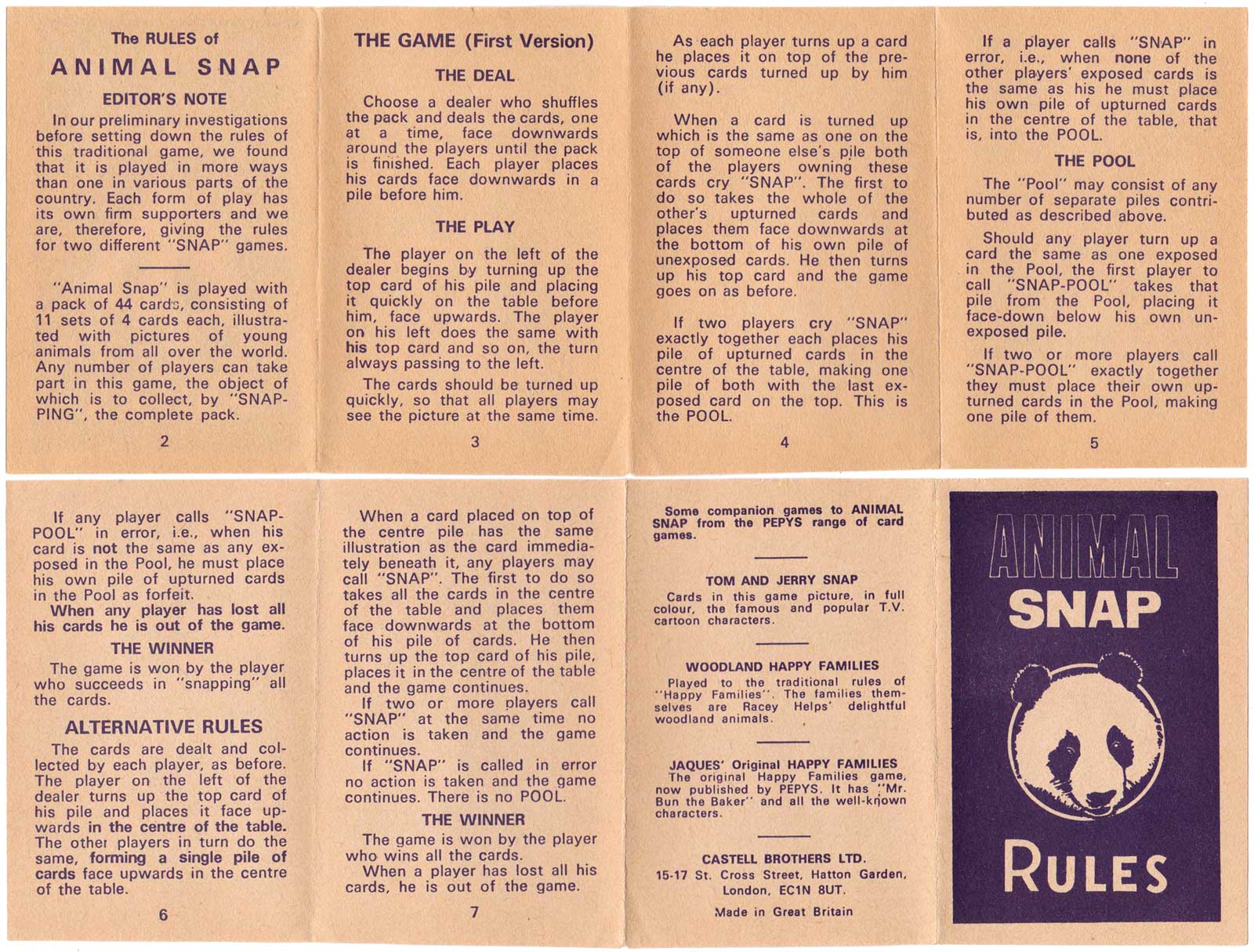 Above: Animal Snap published by Castell Brothers Ltd, 15-17 St Cross Street, Hatton Garden, London EC1N 8UT, c.1960. 44 cards + rules in box.