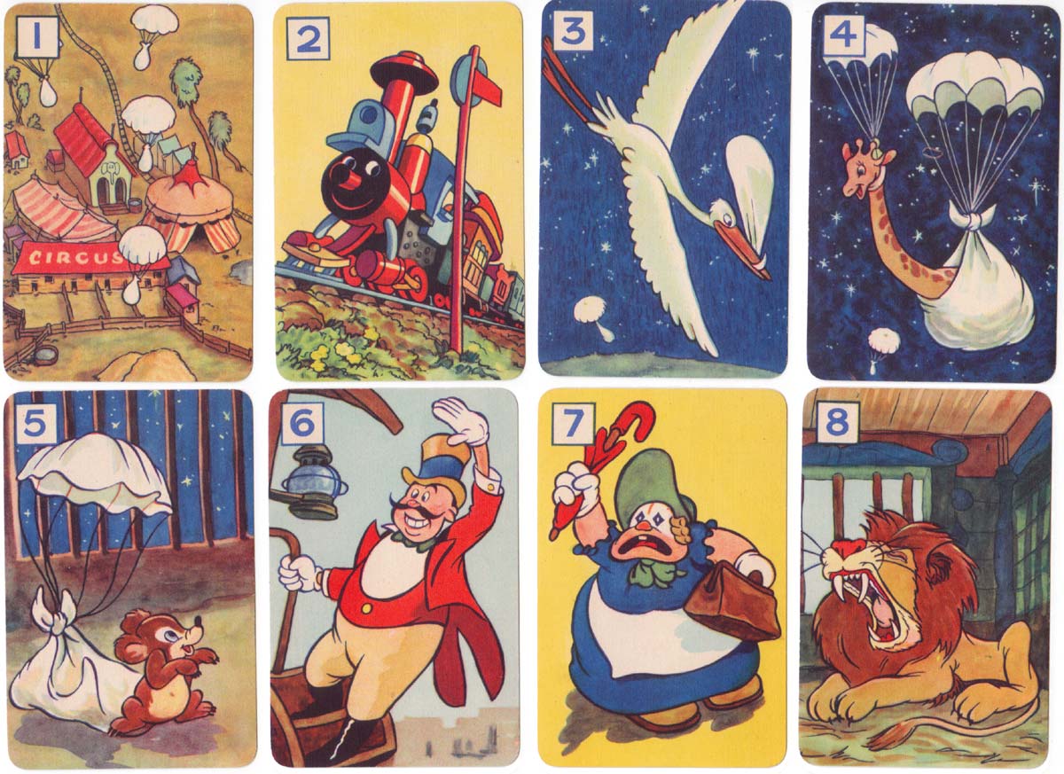 Above: Walt Disney’s Dumbo card game published by Pepys, 1939. 45 cards + rules in box. Dumbo was issued in both red and blue backed versions, and was only identified as Pepys on the box, not in the rules booklet, although it was advertised in other games rules booklets.