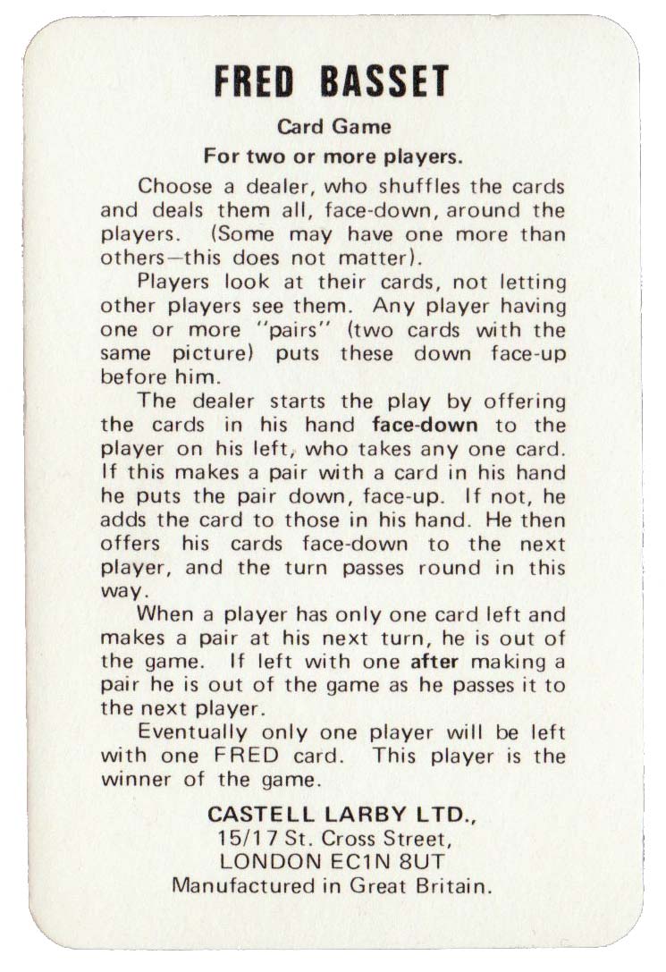 Fred Basset card game was published by Pepys Games in 1977 based on the cartoon strip by Scottish cartoonist Alexander S. Graham (1917–1991) which was first published in the Daily Mail on 8 July 1963. The object of the card game is to make pairs of matching cards but there is only one ‘Fred’ card... See the Rules► See the Box►