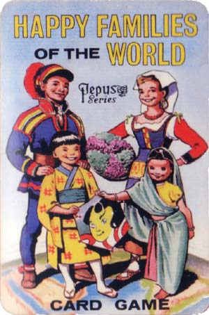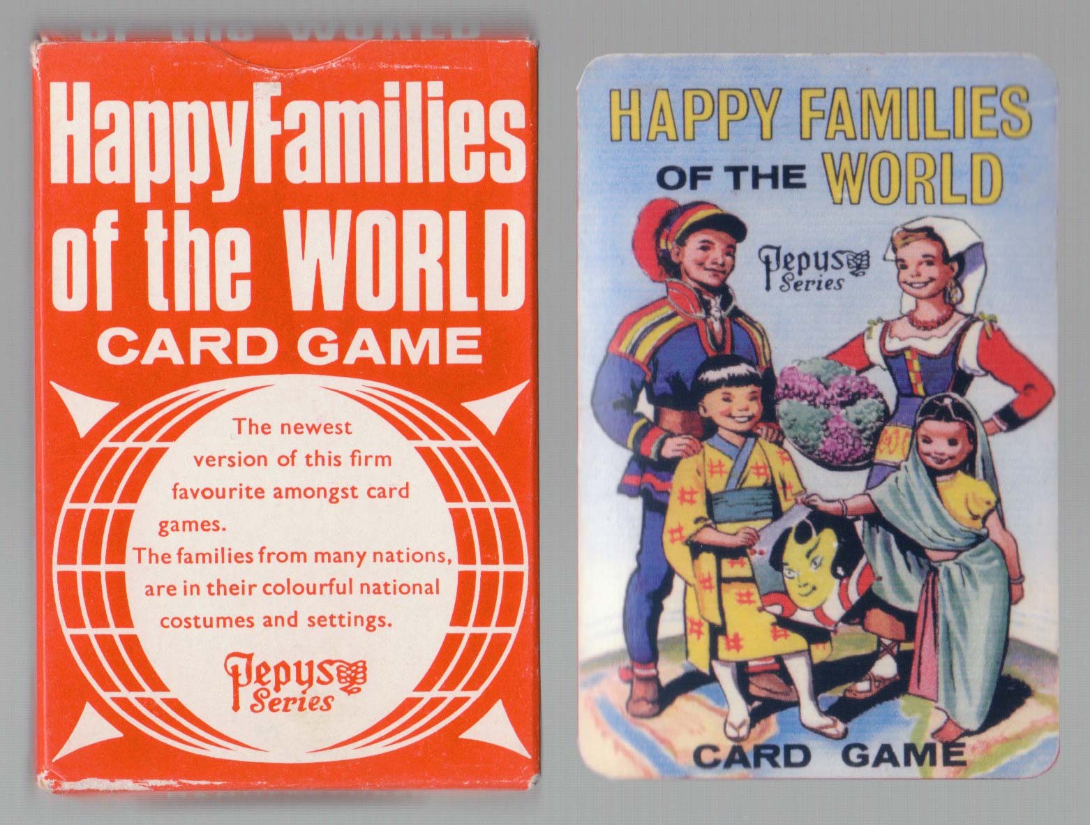 Happy Families of the World card game published by Pepys Games, 2nd edition, 1963. The first edition of Happy Families of the World was published in the mid-1950s in an economy 36-card edition which was very popular. This version has 44 cards with improved pictures, although the national stereotypes are from a different era and not wholly correct today.