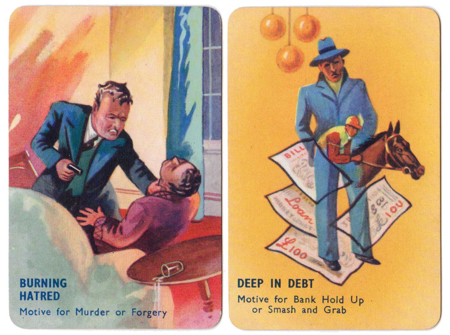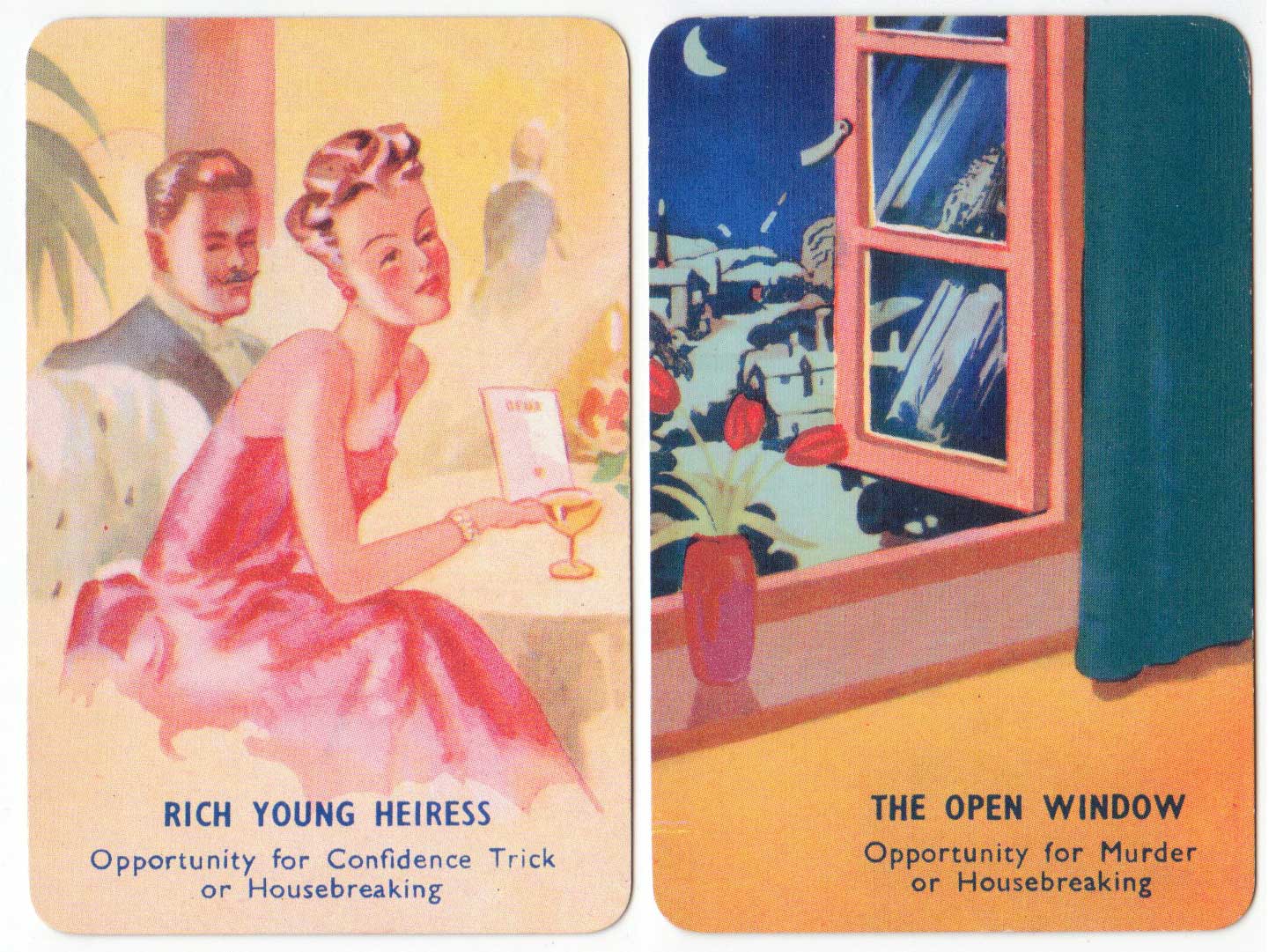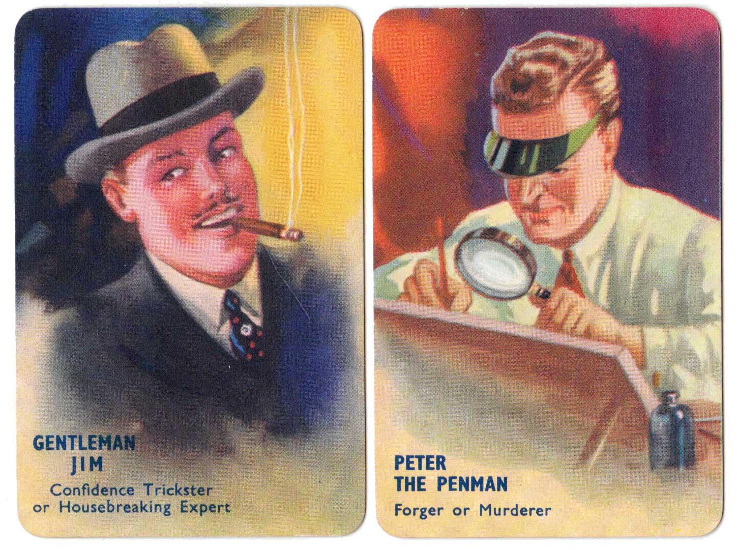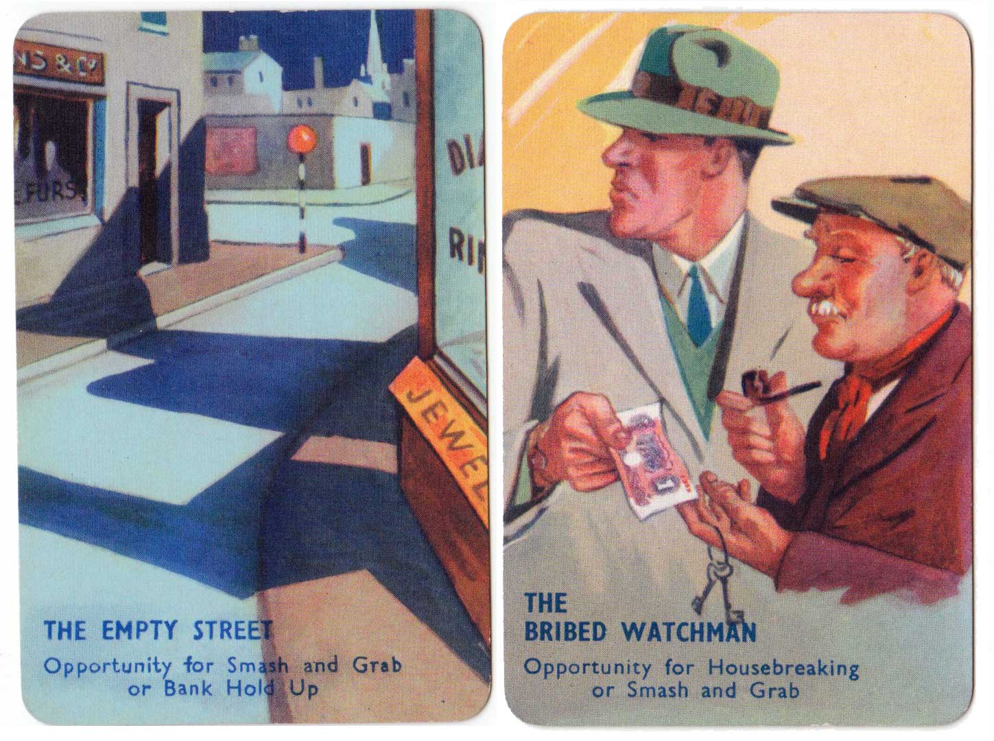 I Commit crime club card game, invented by popular novelist Laurence Meynell, was first published by Pepys in 1948. The marvellous illustrations depict a selection of criminal characters, their motives, opportunities and clues, as well as a number of police constables and inspectors. The object of the game is to get rid of all your cards by committing a crime, such as smash and grab or bank hold up, or by assisting the police to make an arrest. See the Rules►