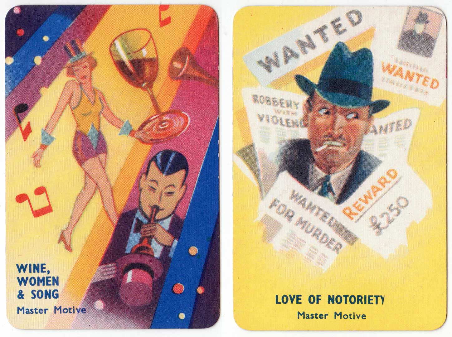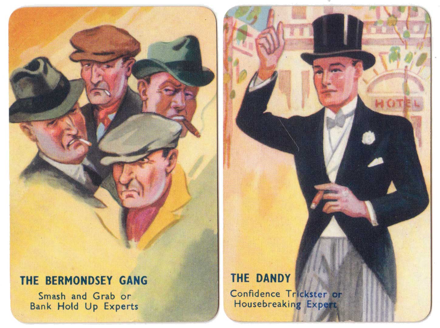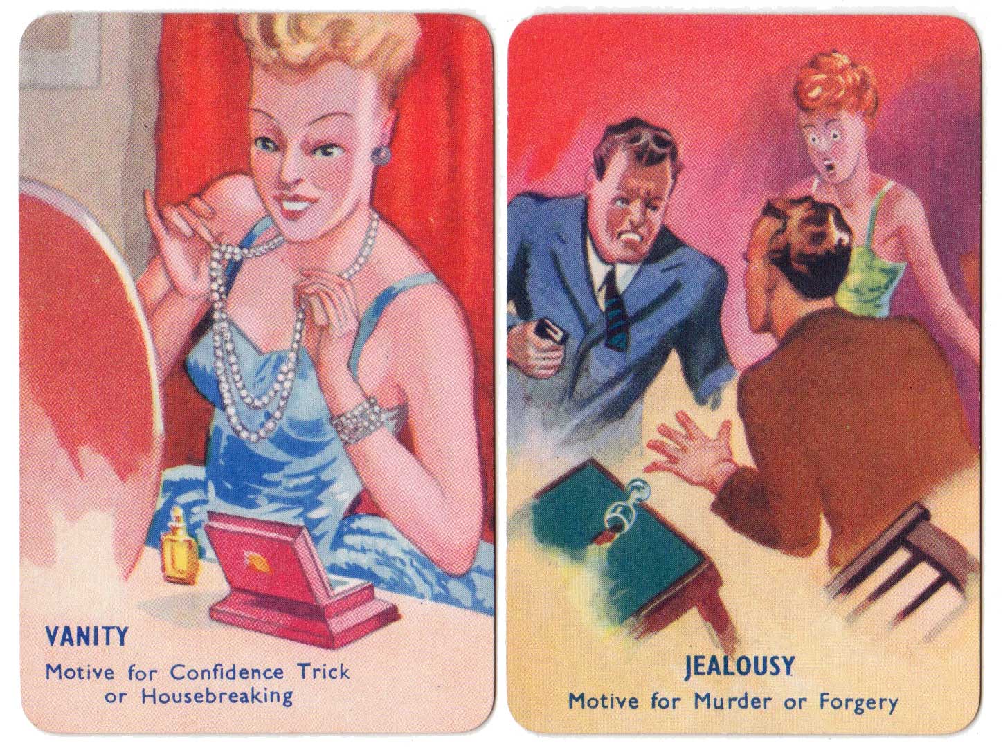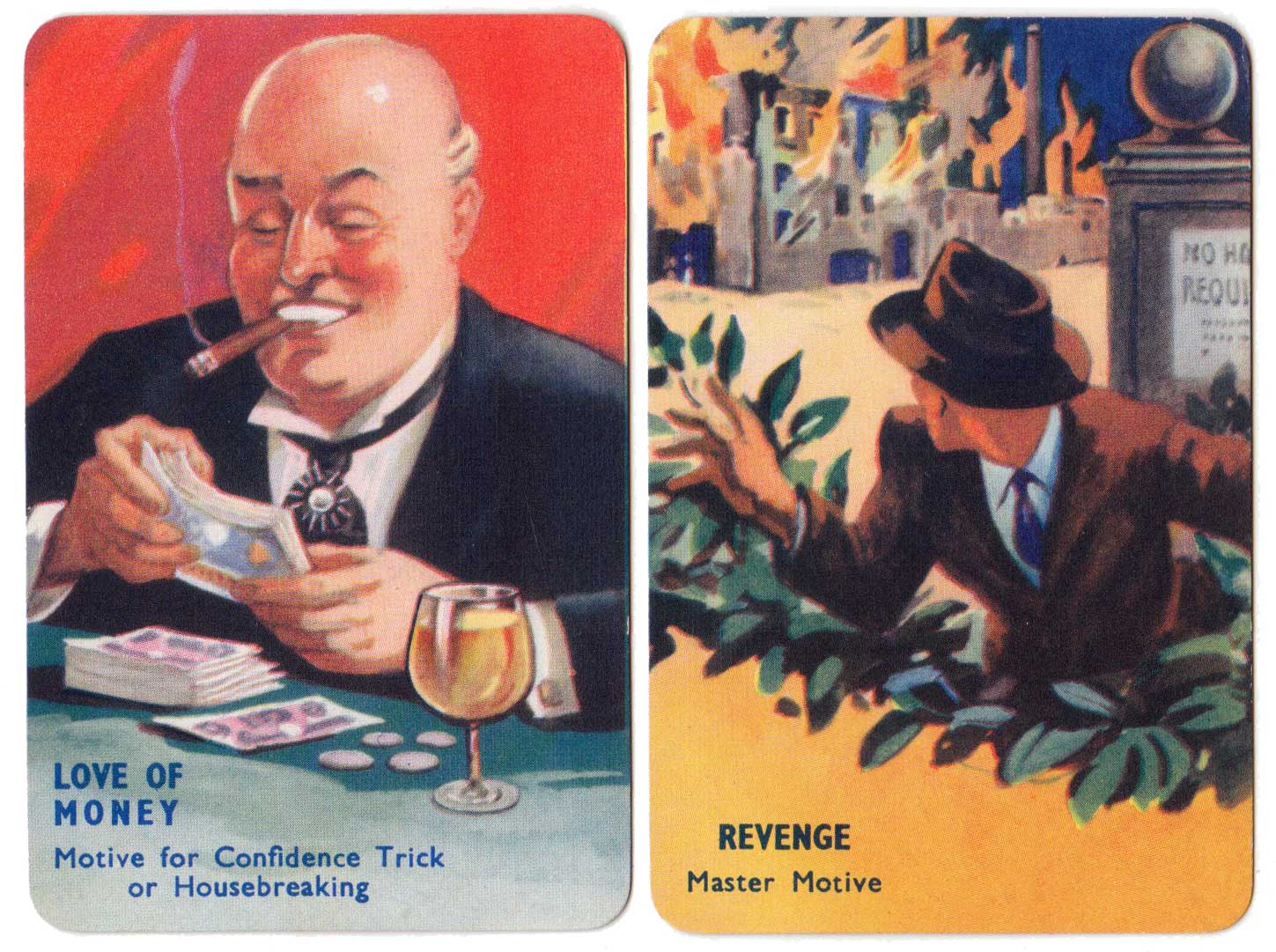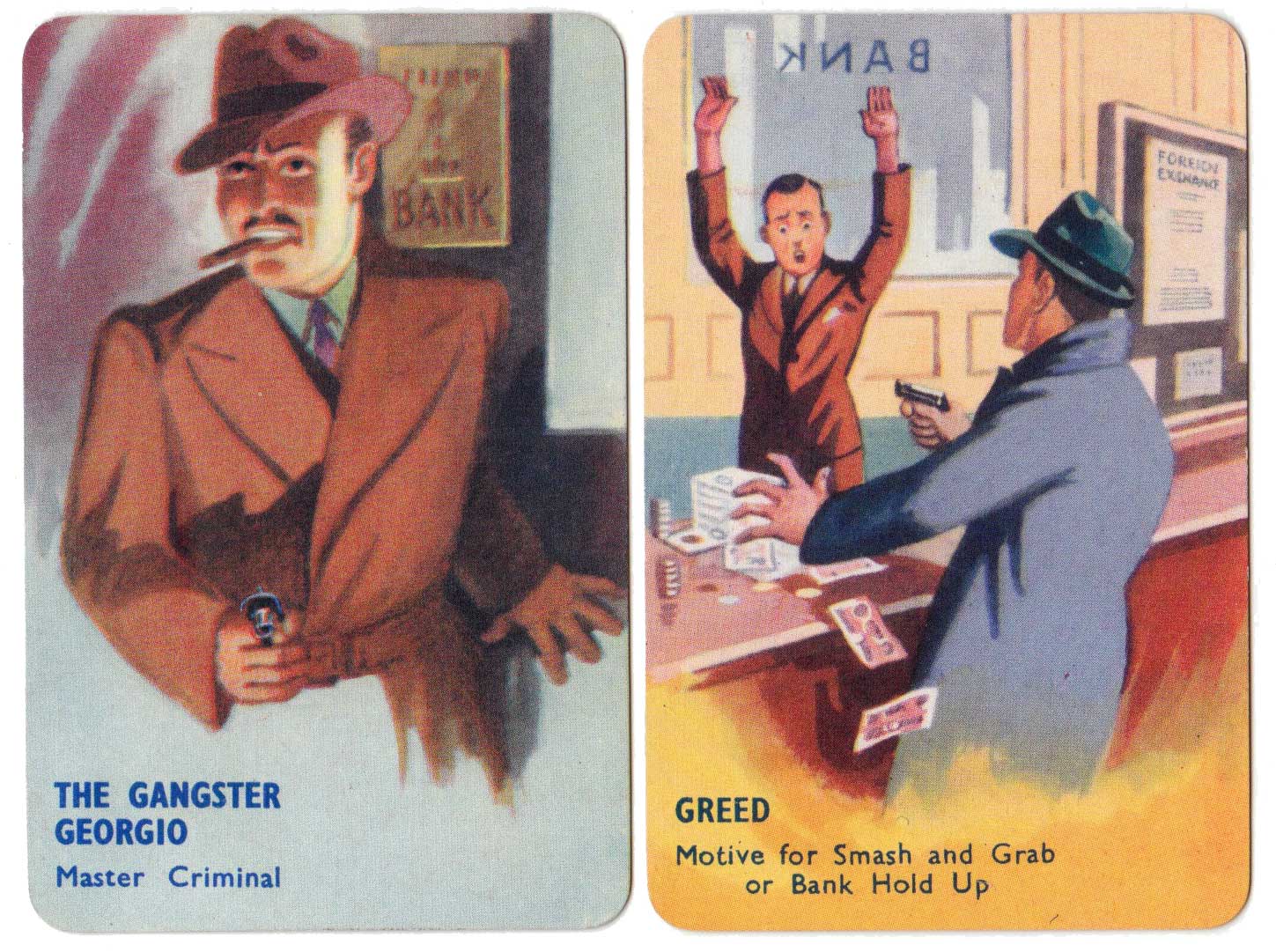I Commit crime club card game, invented by popular novelist Laurence Meynell, was first published by Pepys in 1948. The marvellous illustrations depict a selection of criminal characters, their motives, opportunities and clues, as well as a number of police constables and inspectors. The object of the game is to get rid of all your cards by committing a crime, such as smash and grab or bank hold up, or by assisting the police to make an arrest. See the Rules►