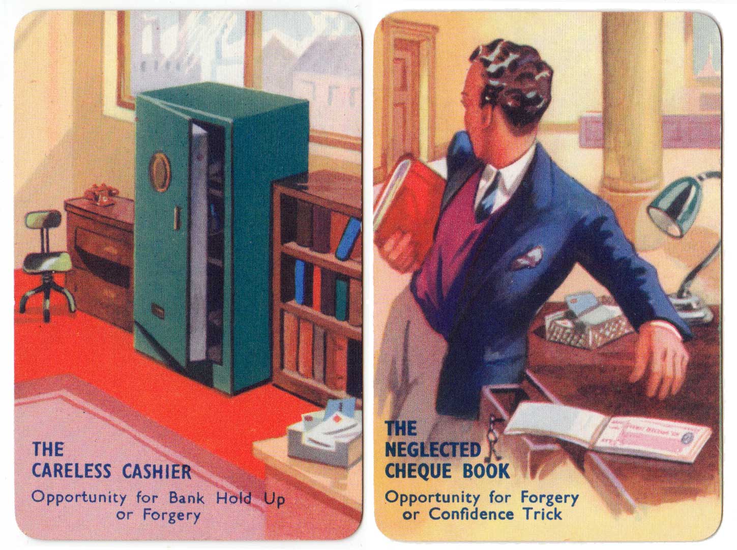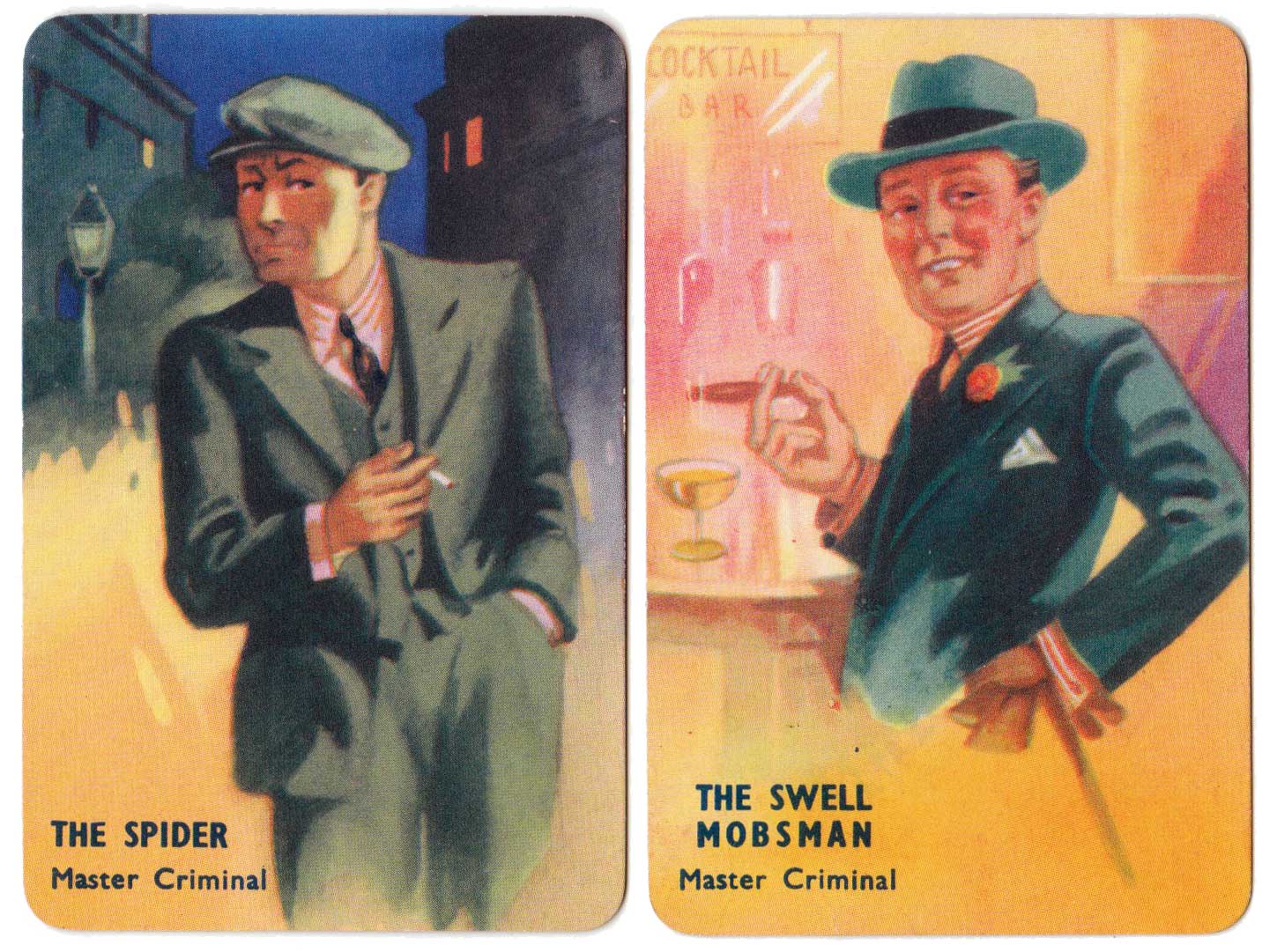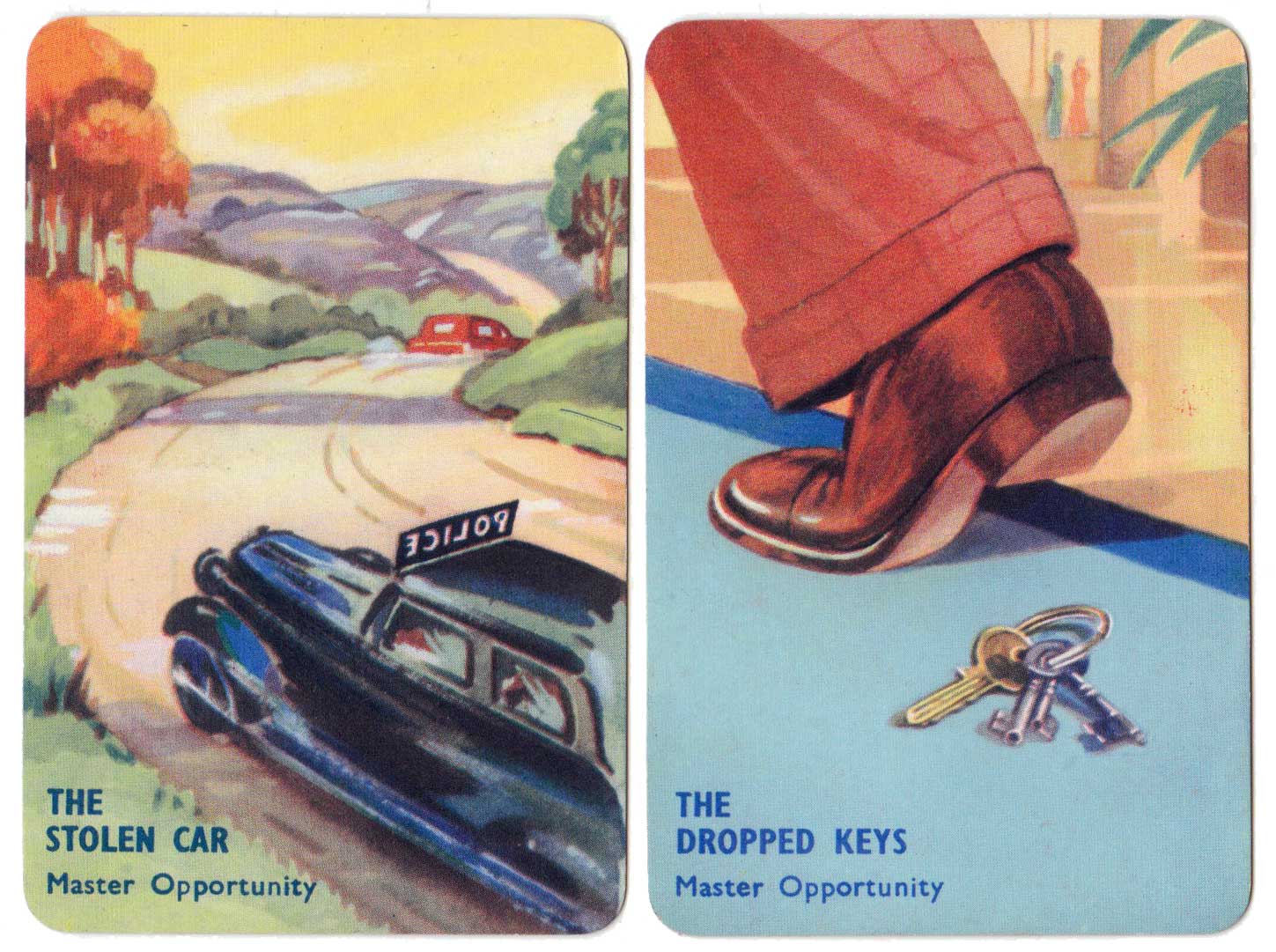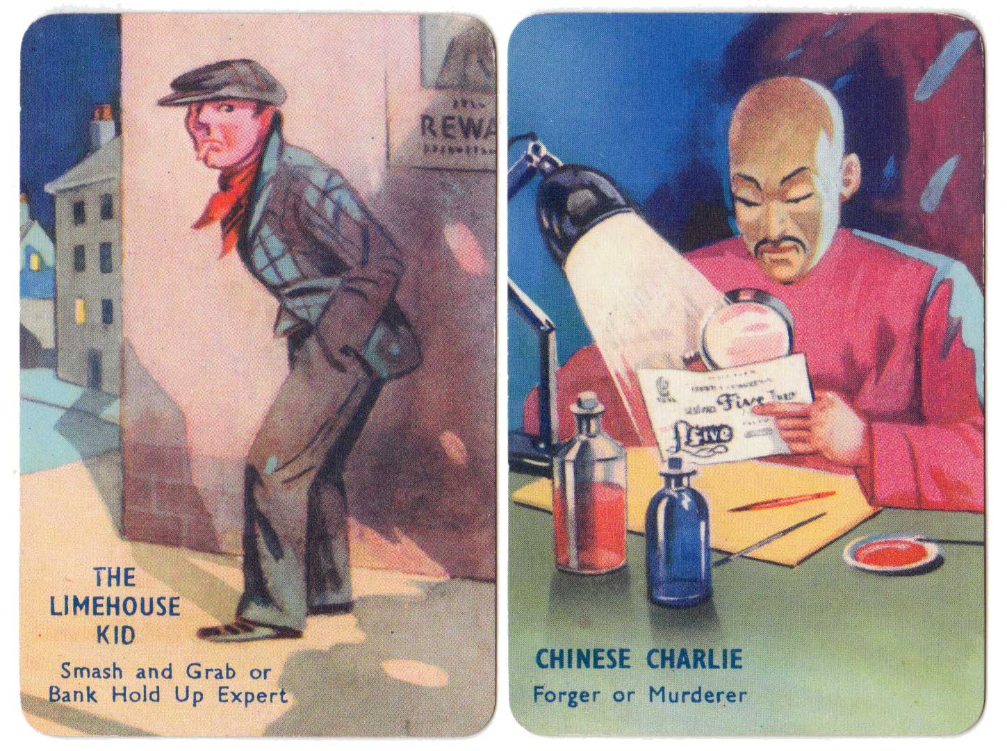 I Commit crime club card game, invented by popular novelist Laurence Meynell, was first published by Pepys in 1948. The marvellous illustrations depict a selection of criminal characters, their motives, opportunities and clues, as well as a number of police constables and inspectors. The object of the game is to get rid of all your cards by committing a crime, such as smash and grab or bank hold up, or by assisting the police to make an arrest. See the Rules►