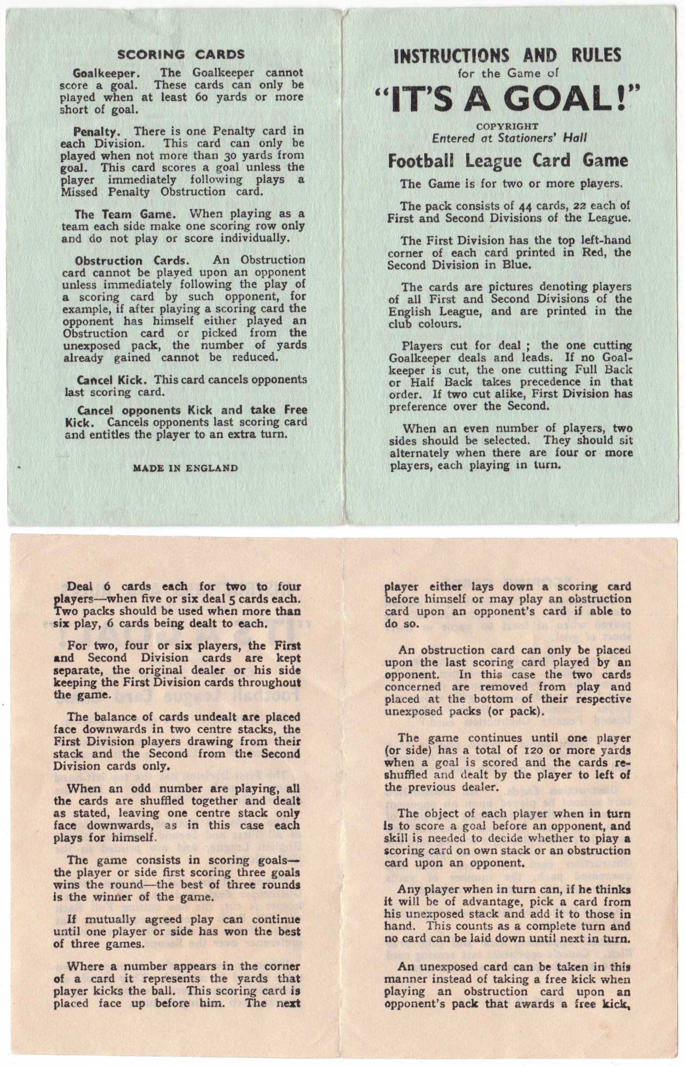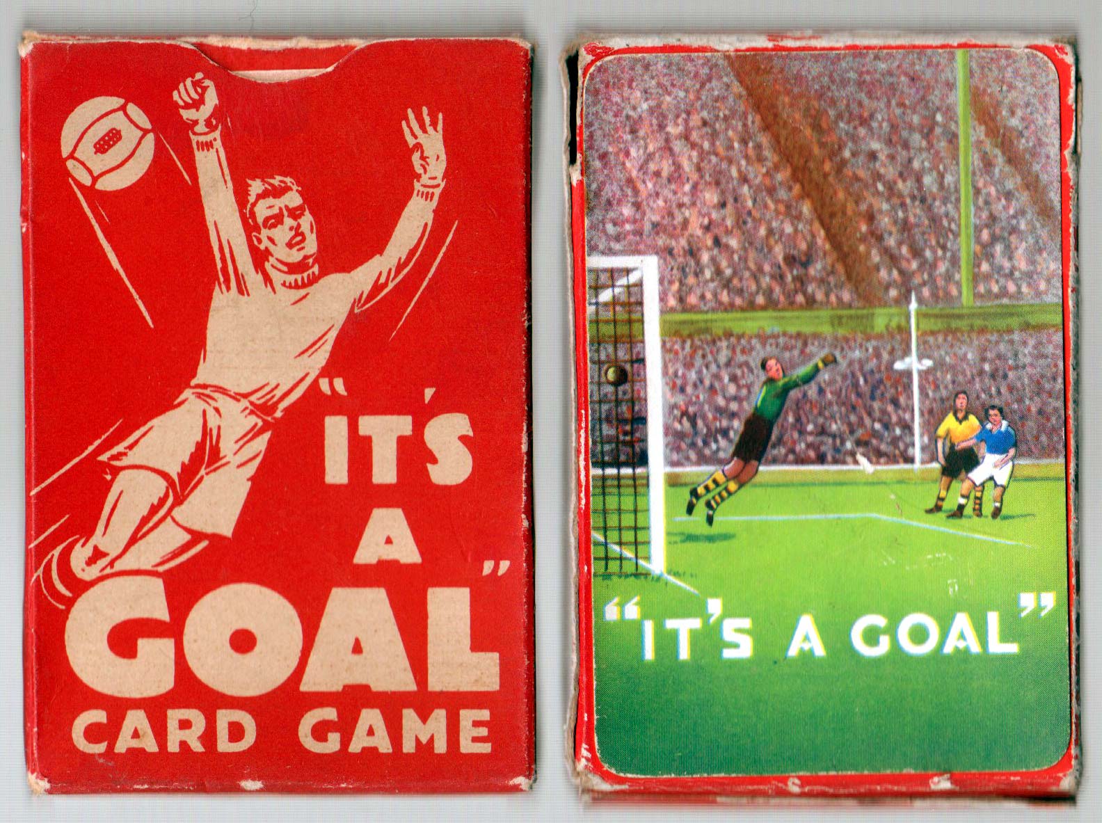 It’s A Goal Football League card game was registered to Castell Bros in July 1939. The cards are pictures denoting players of all First and Second Divisions of the English League, in the club colours. See excerpt from the Instructions►