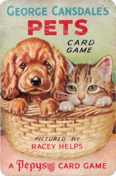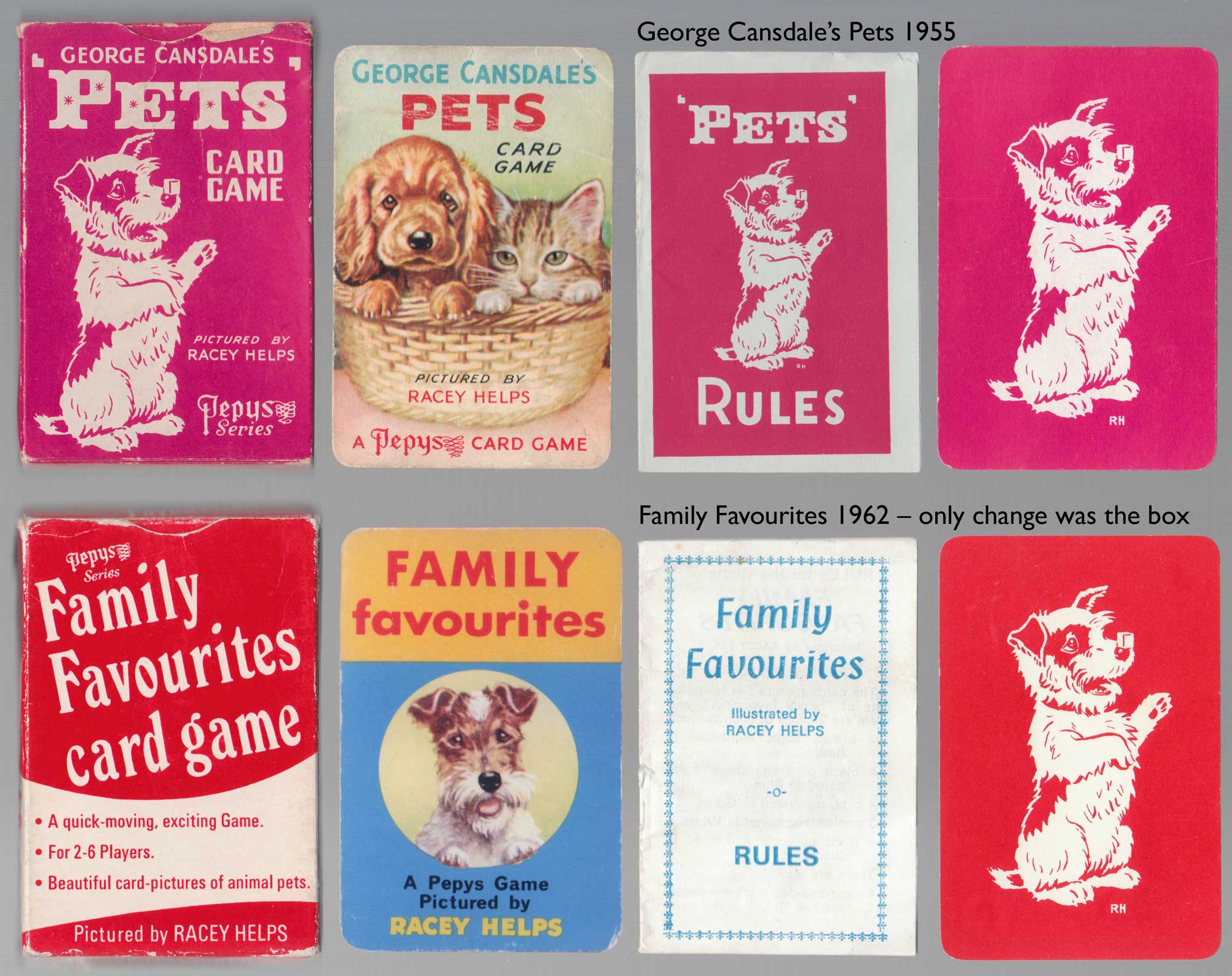 Pets card game illustrated by Racey Helps was published by Pepys Games in 1955 but re-named Family Favourites in 1962.