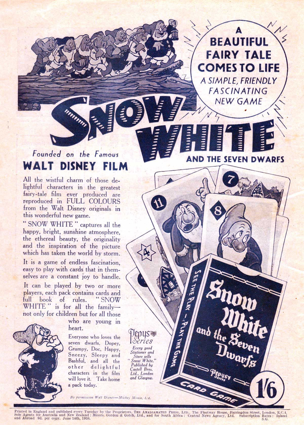 Snow White and the Seven Dwarfs card game - 1st edition published by Castell Brothers Ltd (Pepys), price 1/6d.