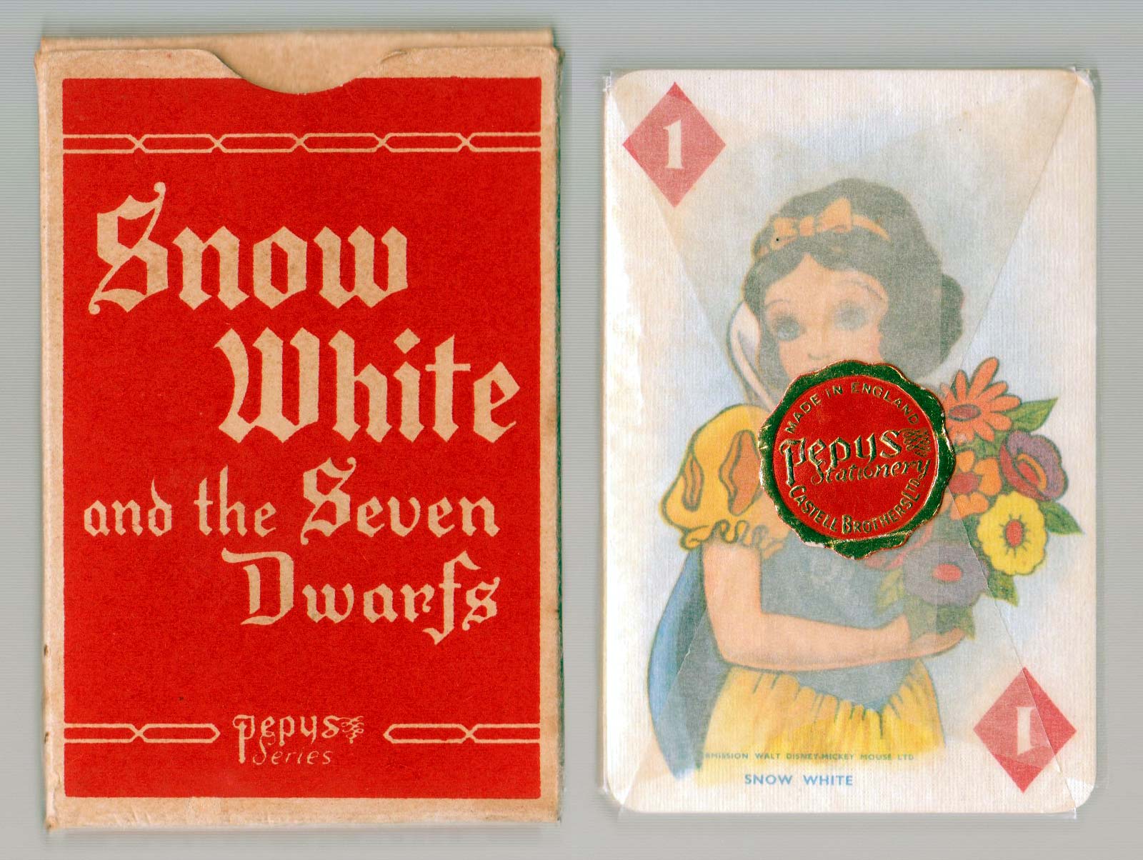 In 1937, the Walt Disney fairytale film “Snow White and the Seven Dwarfs” made a big impact at the first showing in America. Pepys thought it would be a good idea to produce a Snow White card game to tie in with the general release of the film in the UK in 1938. Artists were despatched to sit through endless showings of “Snow White” making drawings for the cards and Kenneth Collins, Castell Bros managing director, sat down to write the rules for the game.