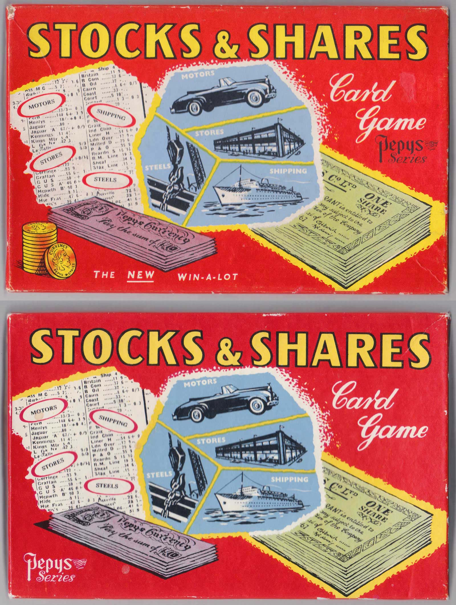 Stocks & Shares card game was first published by Pepys Games in 1957. It is a Double Feature game in that it also includes coloured counters, toy currency, share certificates and share value scoring boards. Basically it is an updated version of Win-A-Lot which had been published in 1951. The 1951 date on the share certificates was not changed although the company names were. During the game share values rise and fall depending on which cards affect them. The object is, by buying and selling shares, to be the player with the most money at the end of the game.