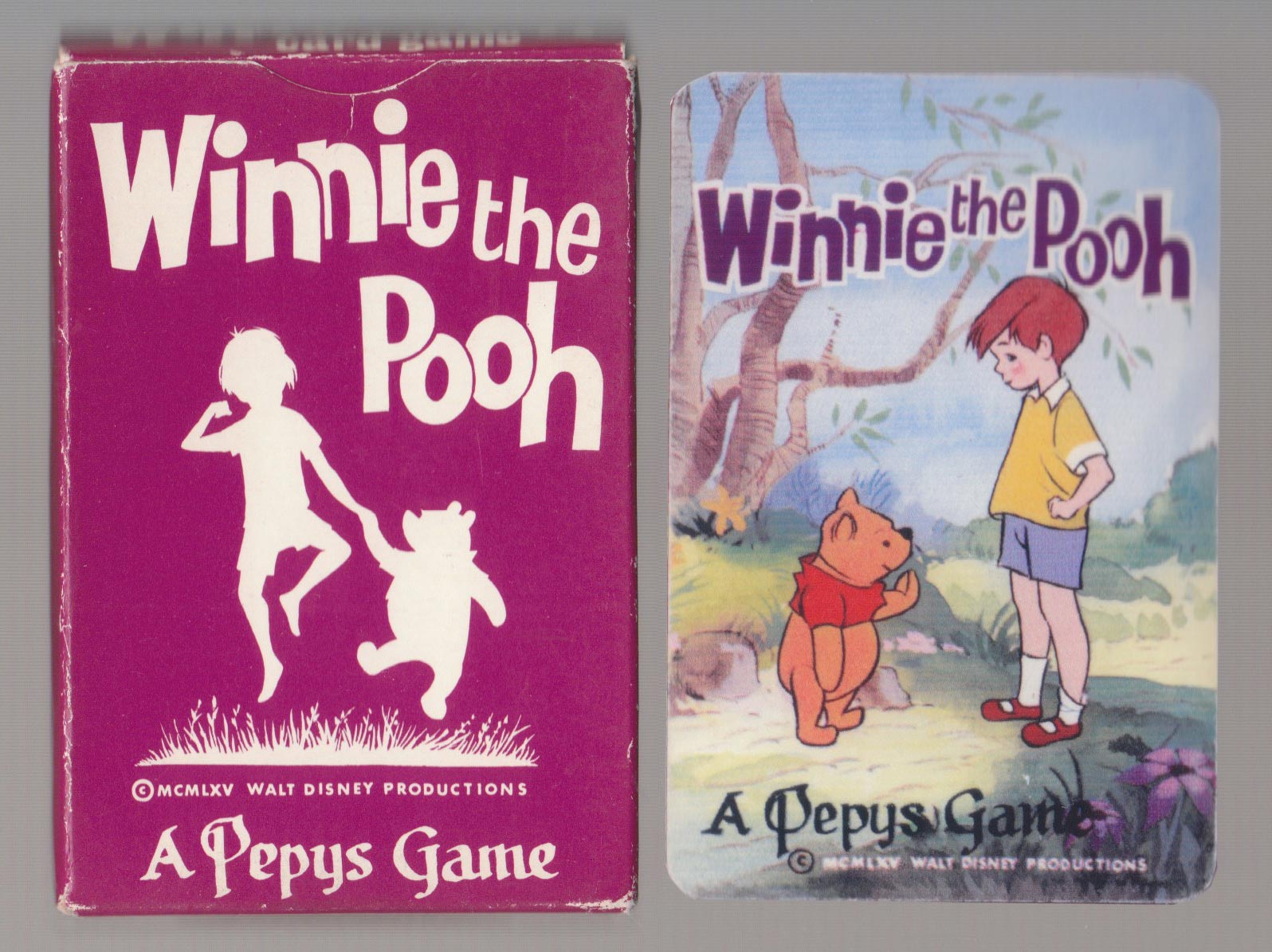 Winnie the Pooh, a card game with characters from the original story by A. A. Milne, was published by Pepys Games in 1965 with artwork adapted from a series of Walt Disney cartoons. A. A. Milne named the character Winnie-the-Pooh after a teddy bear owned by his son, Christopher Robin Milne, who was the basis for the character Christopher Robin. The four numbered cards (Winnie the Pooh, Piglet, Kanga & Roo and Christopher Robin) have a special role during play. See the Box►