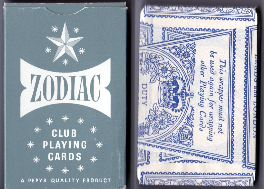 Above: ‘Zodiac Club Playing Cards’ manufactured by Alf Cooke for for Pepys, c.1955-70. The four indices are unusual for this era, and the back designs are also throwbacks to earlier designs. Images courtesy Matt Probert.