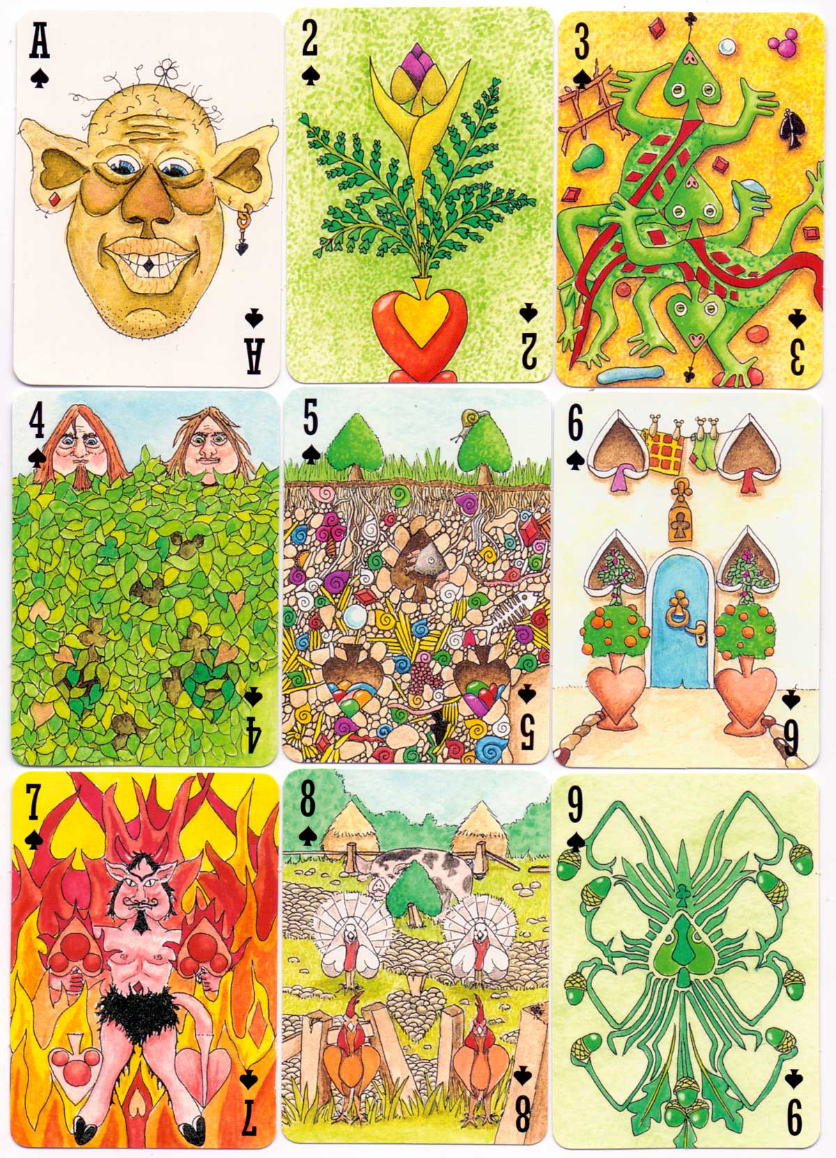 Peter Wood’s “2000Pips” Transformation pack of playing cards (1999) comes in an edition limited to just 1000 packs worldwide. All the pips are cleverly transformed into a vibrantly colourful picture, different on each card, providing endless fascination to the beholder. We see his love of the natural world, particularly the insects, flowers and garden objects, fruits and animals, with almost scientific observation of their minute details.