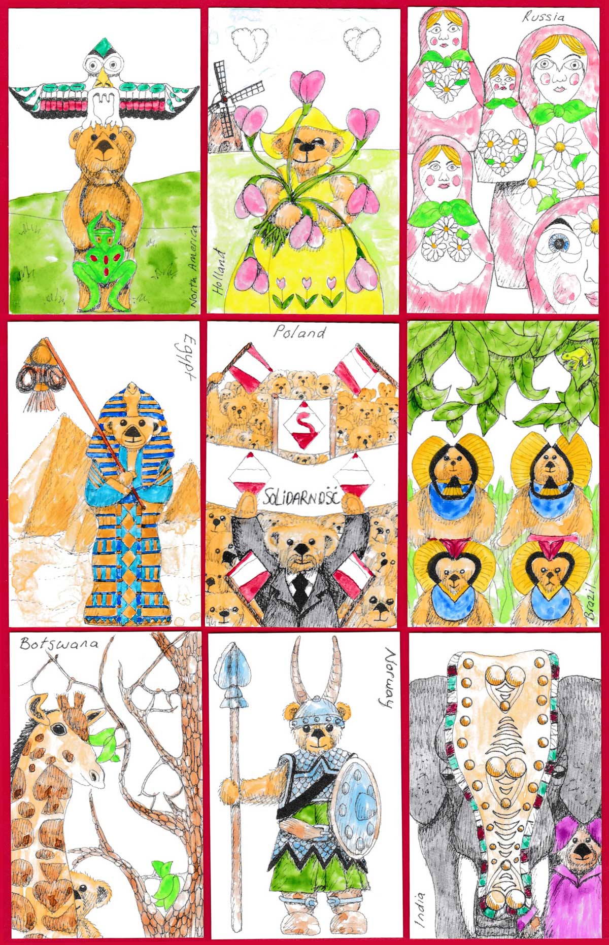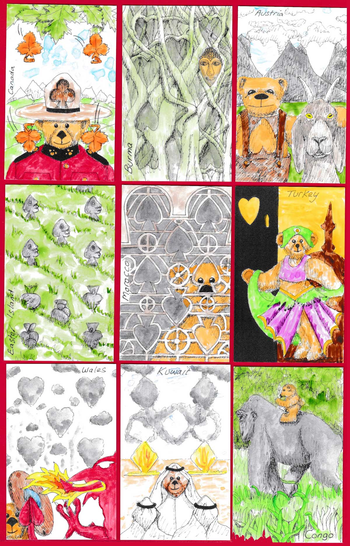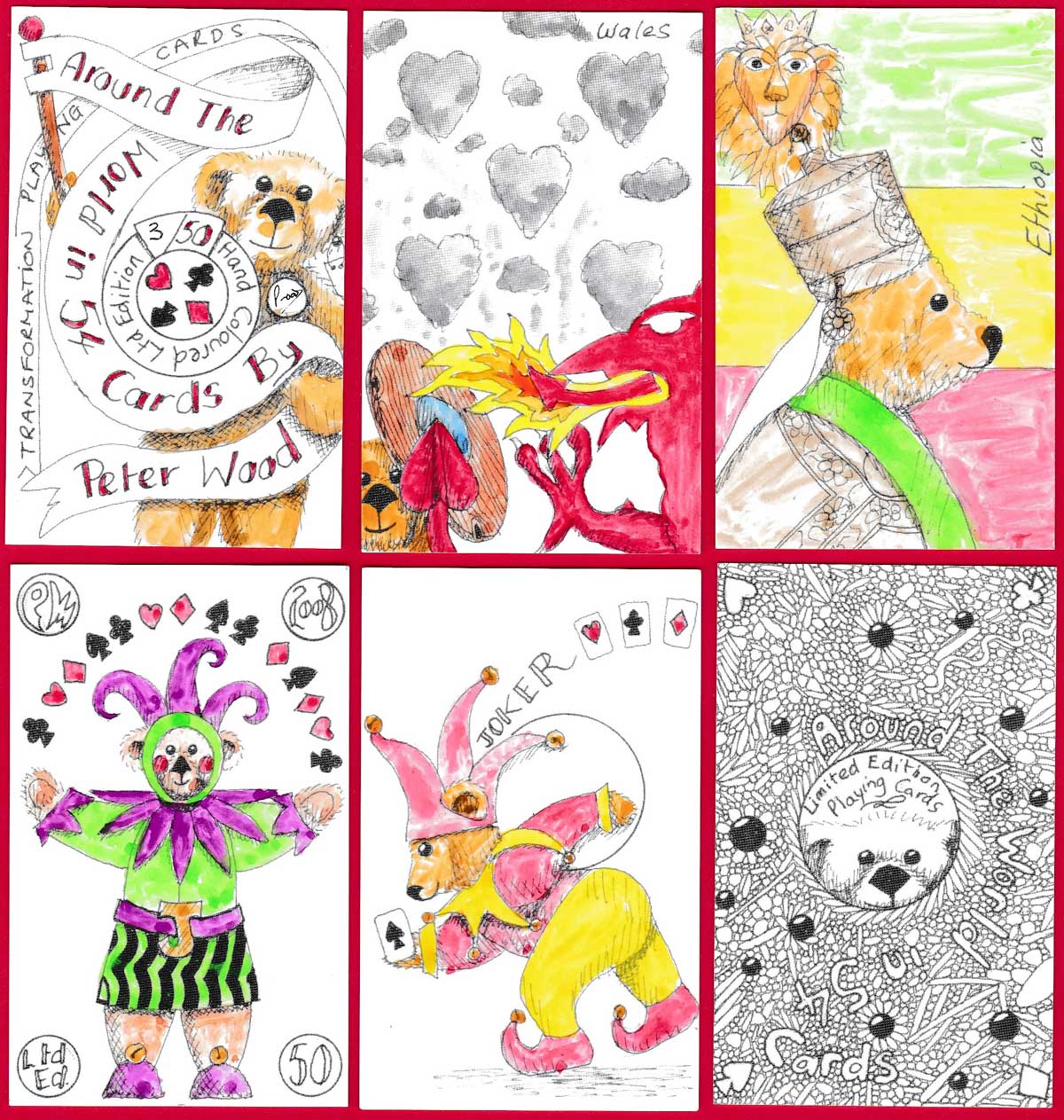 This is a full hand-coloured transformation pack produced by Peter Wood in an edition of just 50 copies. The pack described here is no. 3 of 50. Each of the 54 cards represents a different named country and displays, mainly though not exclusively, an appropriately clad teddy bear. So while Russia (five of hearts) is represented by 5 matryoshka dolls, and Easter Island (ten of spades) shows drawings of the moai (carved human figures with oversize heads), the majority present one or more bears either displayed prominently or surreptitiously hidden within a larger image.