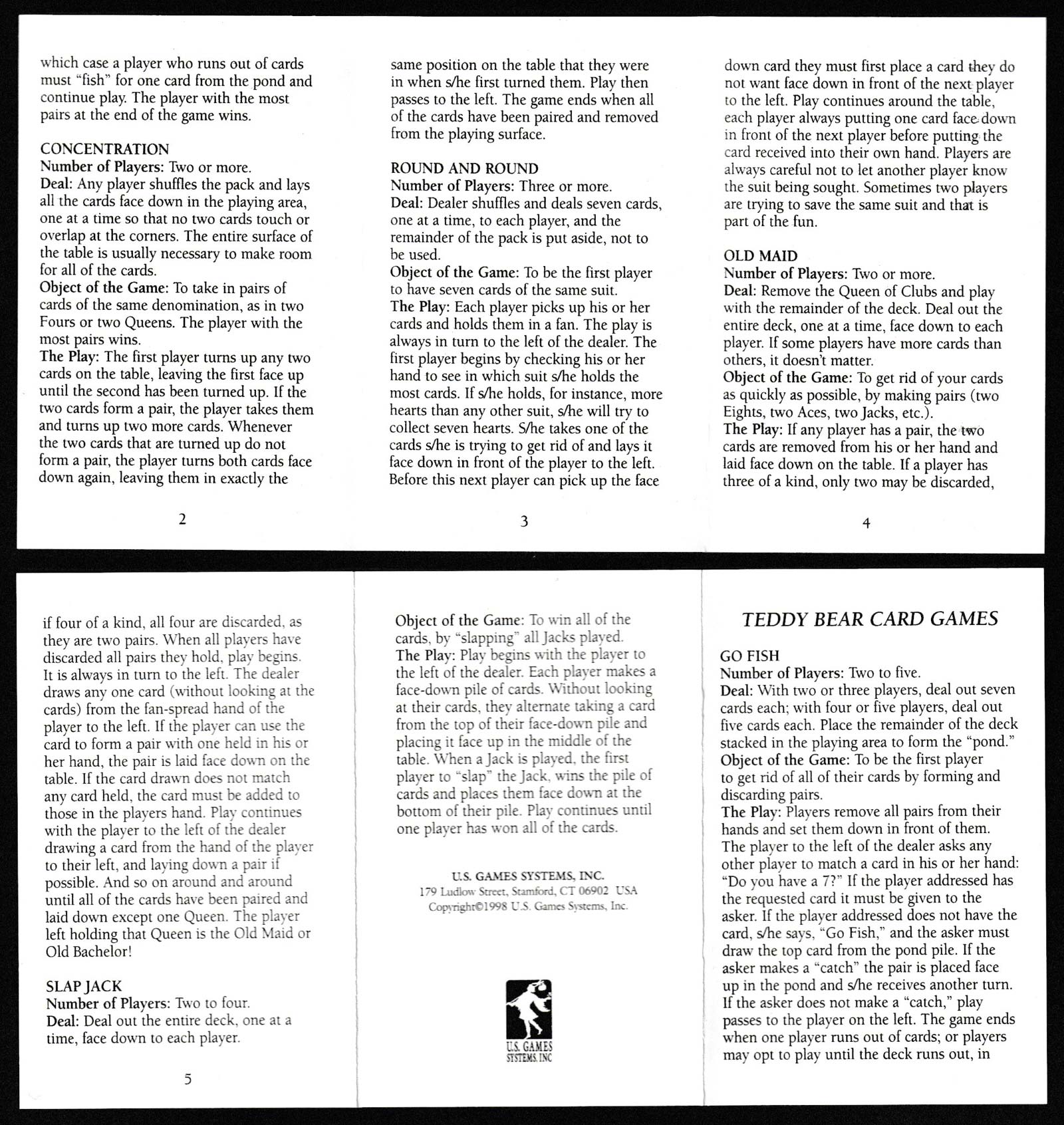 In 1998, another edition of these cards was published under licence from Andrew Jones Art by U.S. Games Systems, Inc. The title card has different wording, and the text on the box has been changed. In fact, the pack has been given a new title, namely "The Teddy Bear Playing Cards and Card Games". Not exactly snappy! There is also a leaflet with rules of various card games - Roddy Somerville.