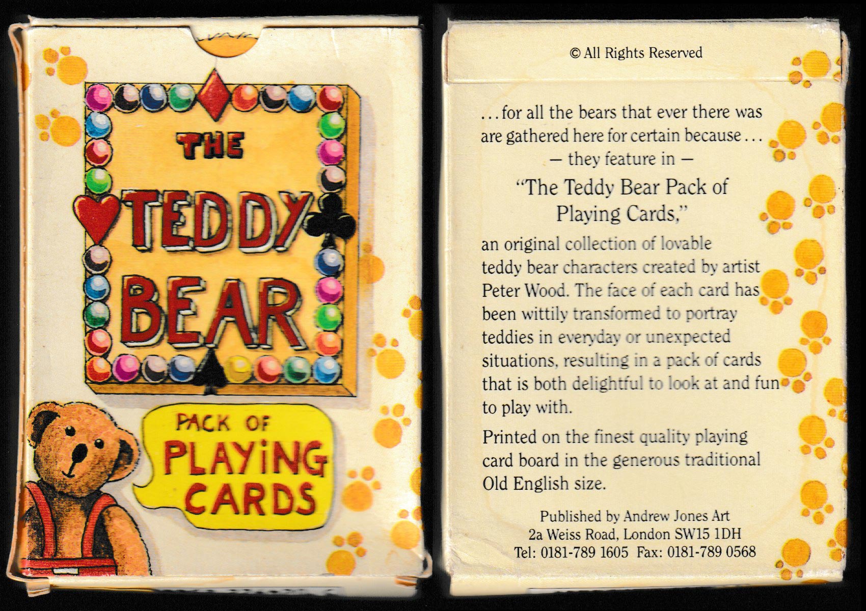 The Teddy Bear pack of transformed playing cards was created by Peter Wood and first published by Andrew Jones Art in 1994, a lovable collection showing teddies in unexpected situations on all the numeral cards. See the box►
