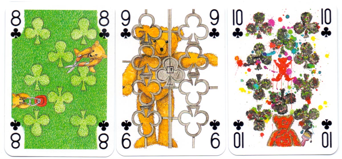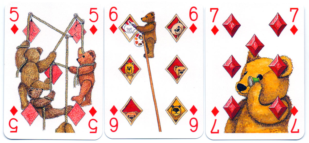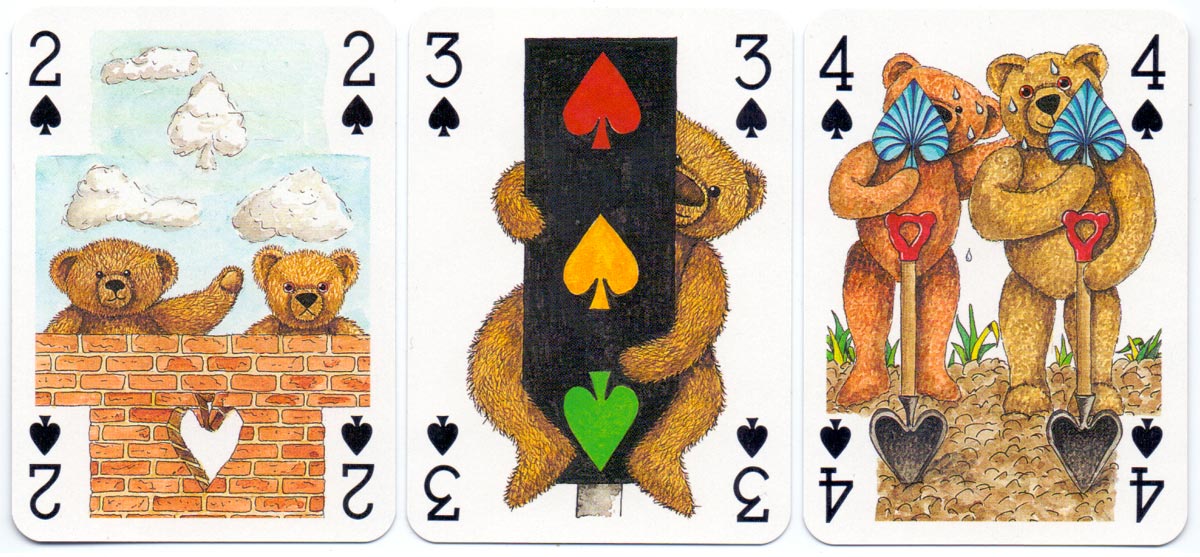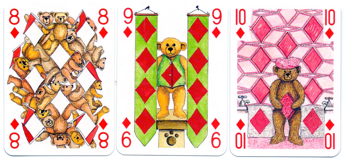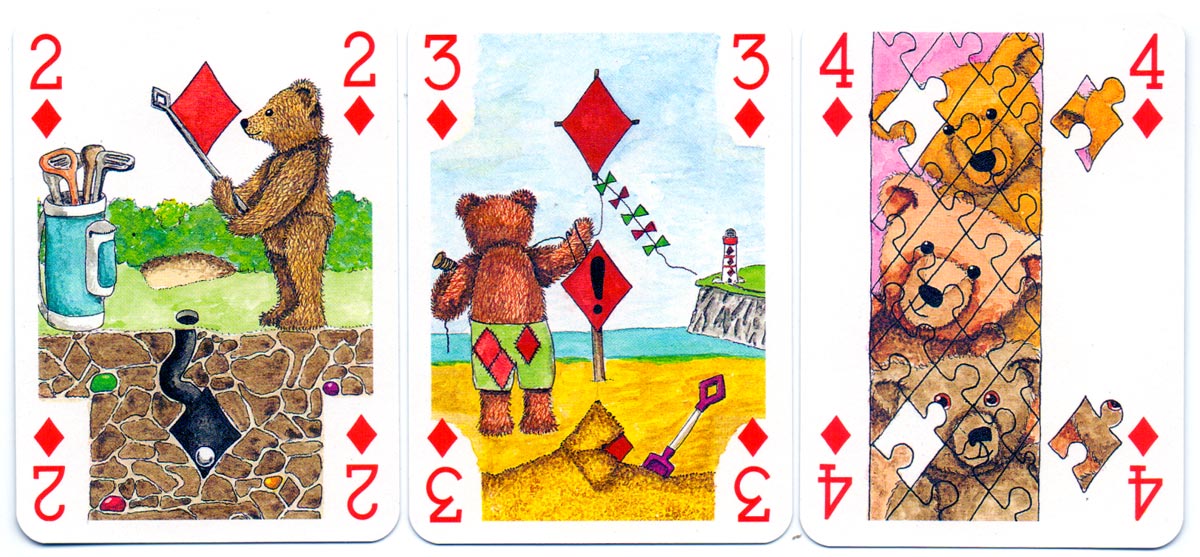 Above: court cards and aces from the Teddy Bear pack of playing cards created by Peter Wood and published by Andrew Jones Art, 1994. Manufactured by Carta Mundi.