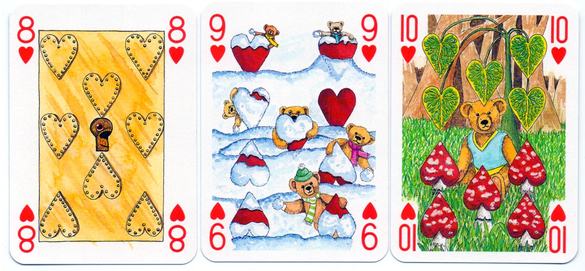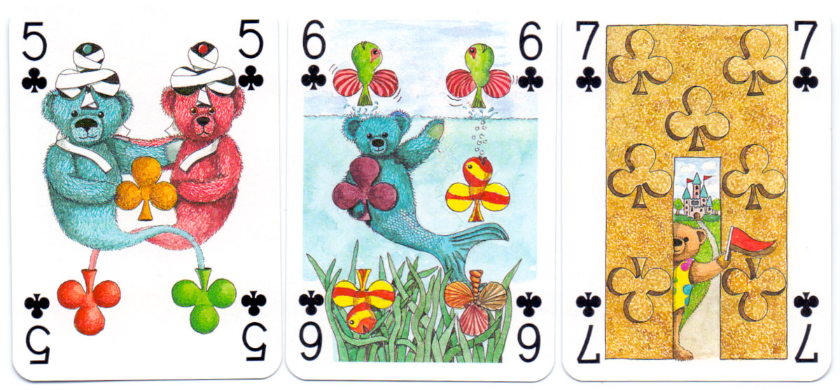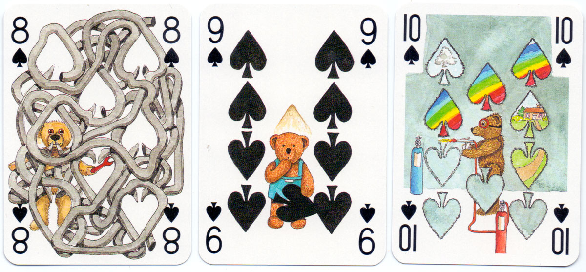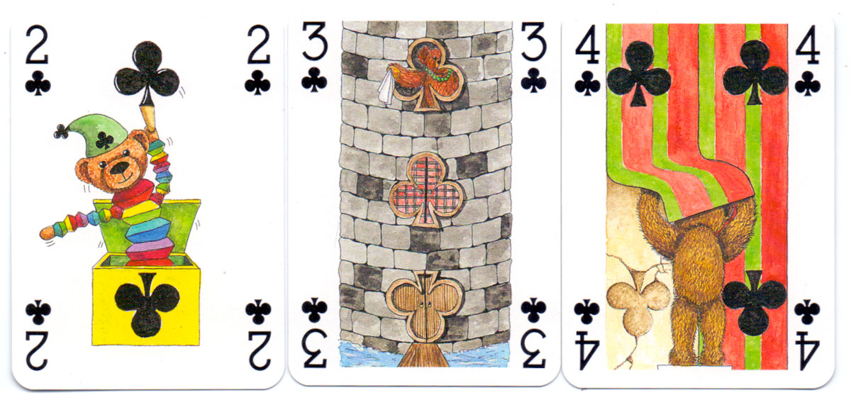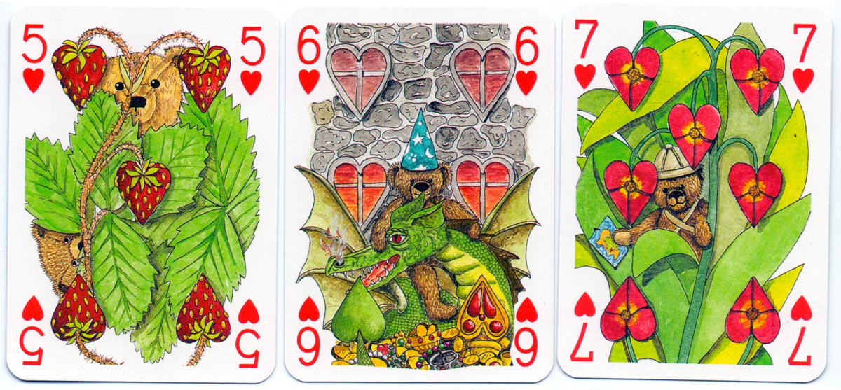 Above: court cards and aces from the Teddy Bear pack of playing cards created by Peter Wood and published by Andrew Jones Art, 1994. Manufactured by Carta Mundi.