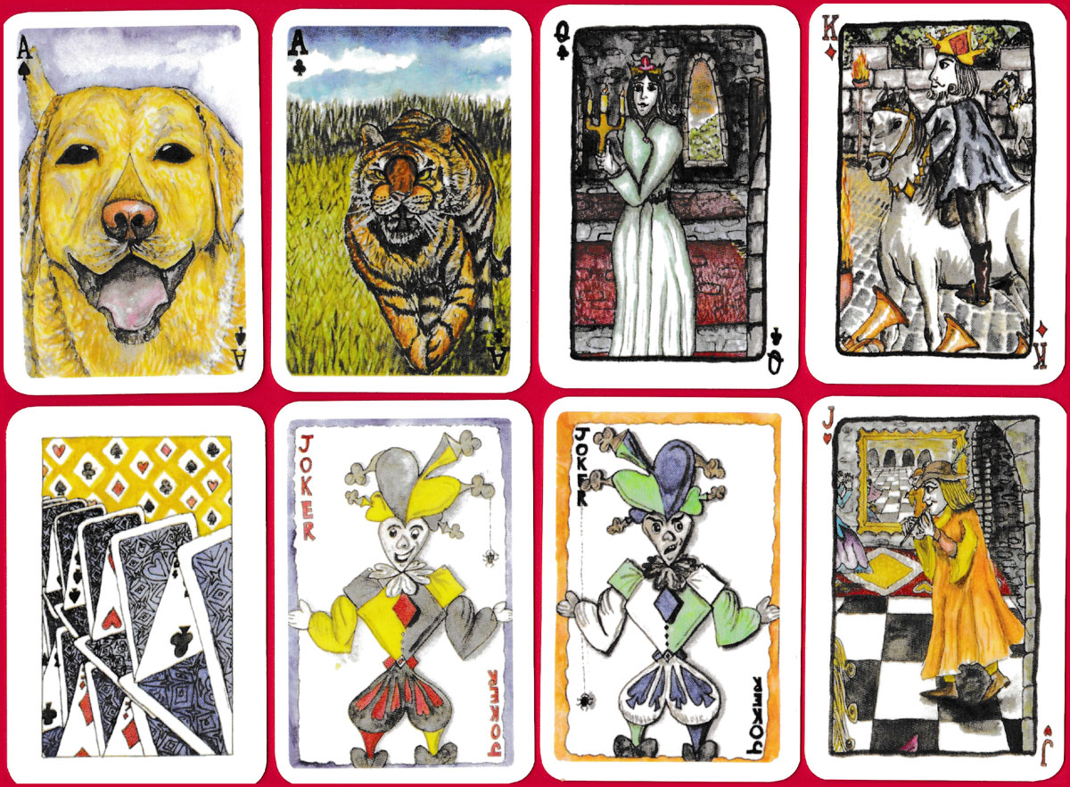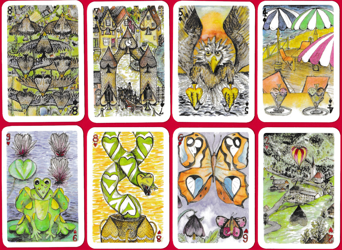 This is a limited edition of only 100 packs, produced by the Guernsey artist Jennifer Gaudion, in 2001. Illustrated with watercolour paintings, this is a full transformation pack of 54 cards which transforms the standard layout of pips into unique and colourful pictures.