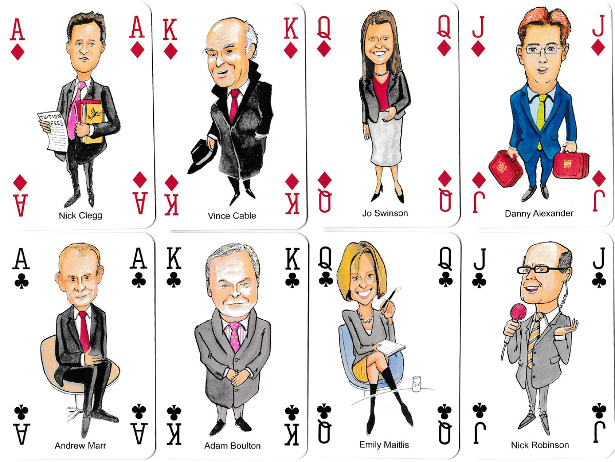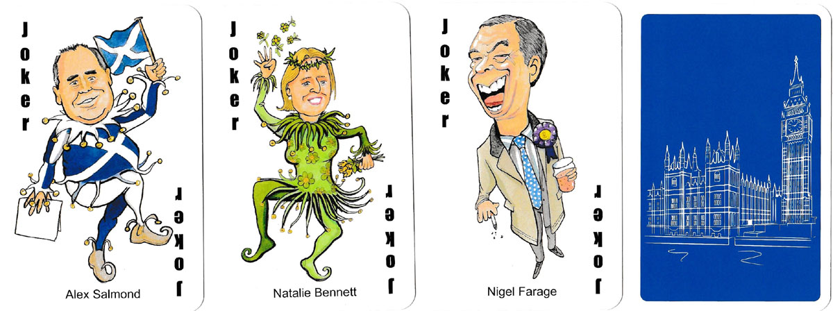 The cards feature the following politicians: Spades – Conservatives: David Cameron, George Osborne, Theresa May, Boris Johnson; hearts – Labour: Ed Miliband, Ed Balls, Yvette Cooper, Douglas Alexander; diamonds – Liberal Democrats: Nick Clegg, Vince Cable, Jo Swinson, Danny Alexander; clubs – Media: Andrew Marr, Adam Boulton, Emily Maitlis, Nick Robinson. The jokers are Nigel Farage (UKIP), Nathalie Bennett (Green Party), and Alex Salmond (SNP).