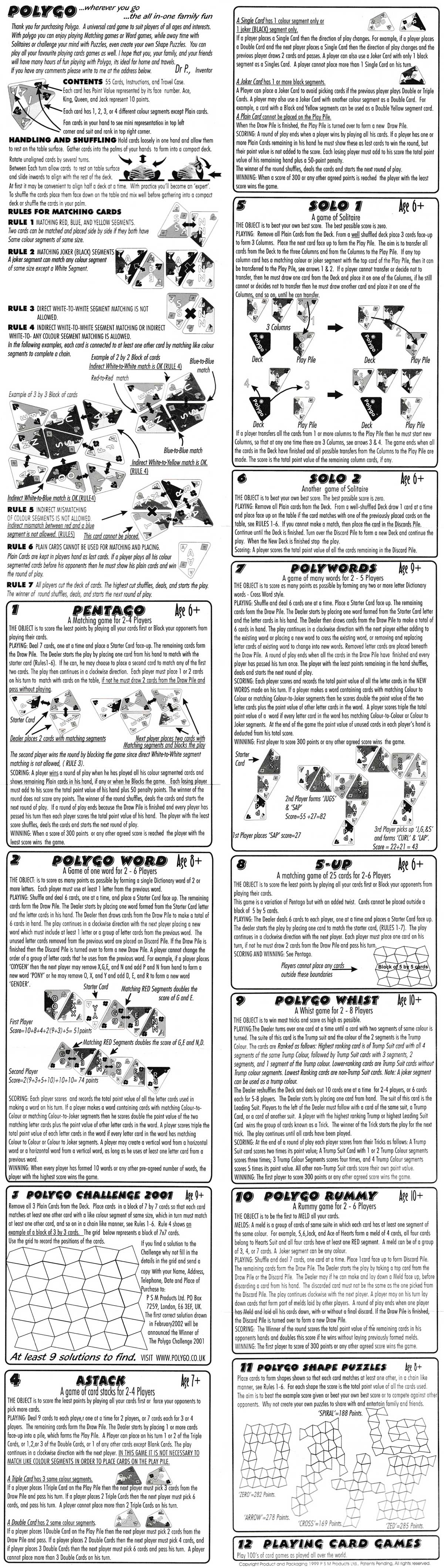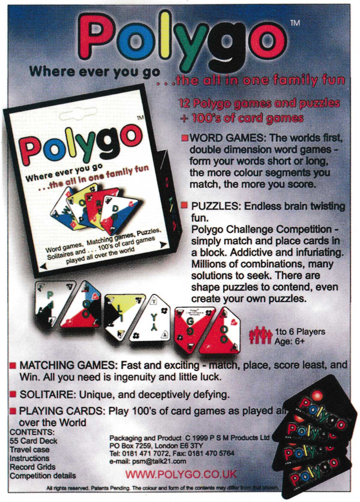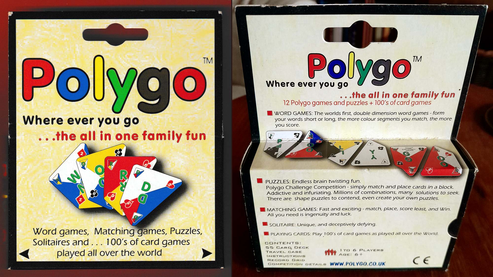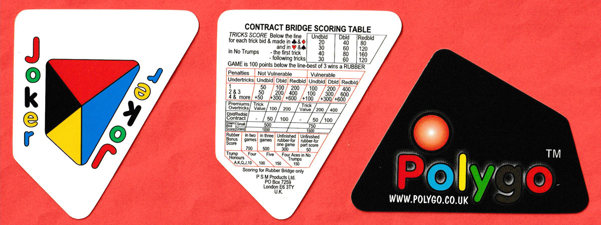Above: Polygo™ made by Richard Edward Ltd, Plumstead, UK. Published by PSM Products Ltd, London, UK, 1999. 52 cards + 2 (identical) Jokers + 1 bridge scoring card + fold-out leaflet in clear plastic box housed in a tuck box with tab. Size: 55 x 80 mm approx. (at widest point).