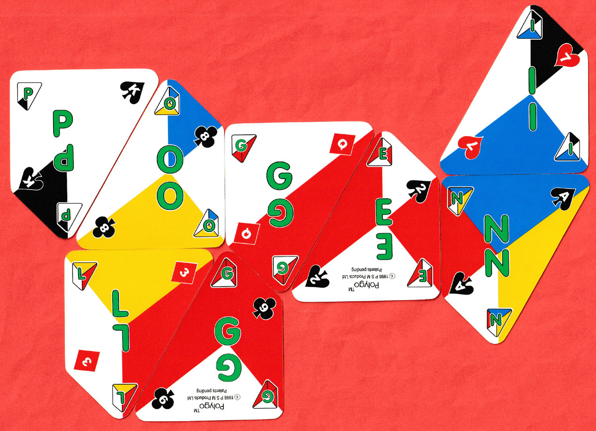 As card shapes go, this must rate as one of the most unusual. The inventor, a certain “Dr P.”, proposes 12 ways of playing games with these cards in the accompanying leaflet . These range from traditional card games to word games to matching games (by shape or by colour). Solitaire (or patience) games are also included. On five of the cards, one can read “Polygo™ / © 1998 P S M Products Ltd / Patents pending”.