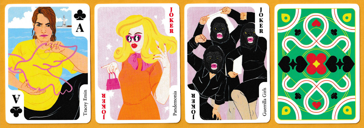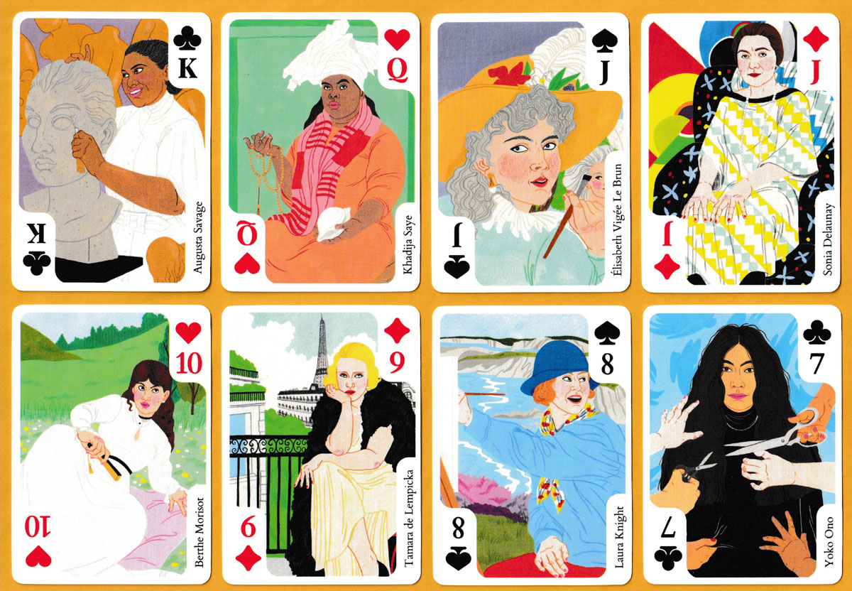 At first glance, almost more striking than the splendid green and yellow box and the original illustrations of women artists of all periods by Laura Callaghan is the fact that this is a totally left-handed pack! Each of the women artists featured is depicted in an appropriate environment and in a style reminiscent of their work and each is clearly named. To give the pack some structure, the four suits have been reimagined as Seers (H), Warriors (S), Influencers (D), and Dissenters (C). The extensive accompanying book with text by Lydia Miller contains full biographical details alongside an enlarged image of each card design. The set was designed by Joséphine Grenier • See the box & bookcover