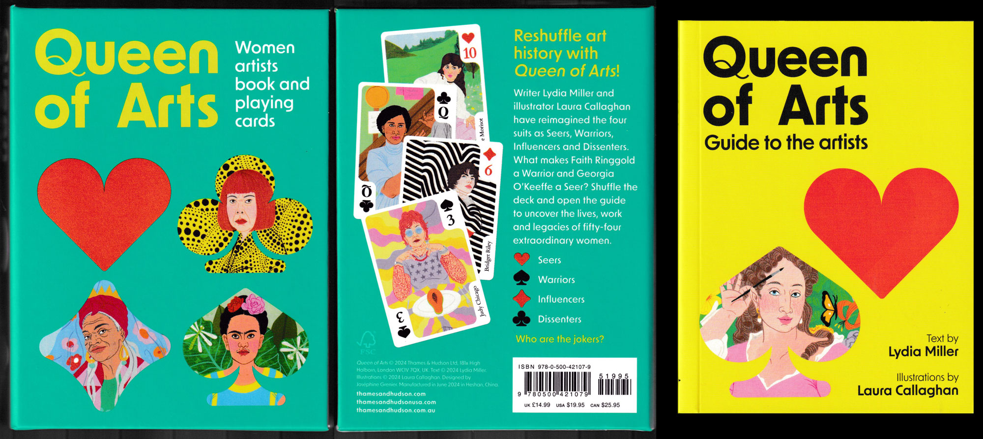 Above: Queen of Arts playing cards published by Thames & Hudson Ltd, London, UK, 2024. Made by Leo Paper Products Ltd, Heshan, China. 52 cards + 2 Jokers + 116-page book in slipcase. Size: 63 x 88 mm. Queen of Arts © 2024 Thames & Hudson Ltd, London. Text © 2024 Lydia Miller. Illustrations © 2024 Laura Callaghan. Purchased at the National Portrait Gallery, London, December 2024.