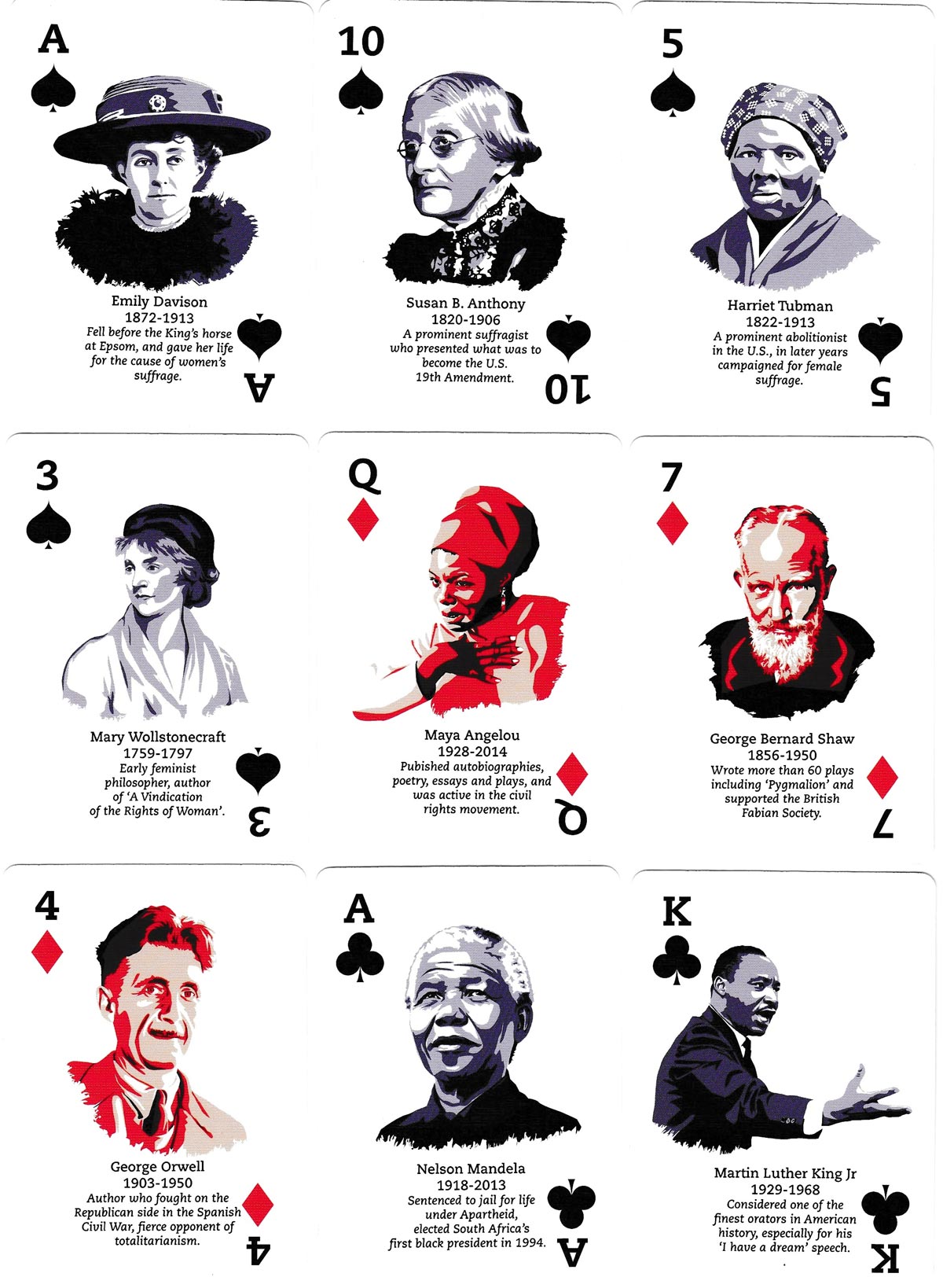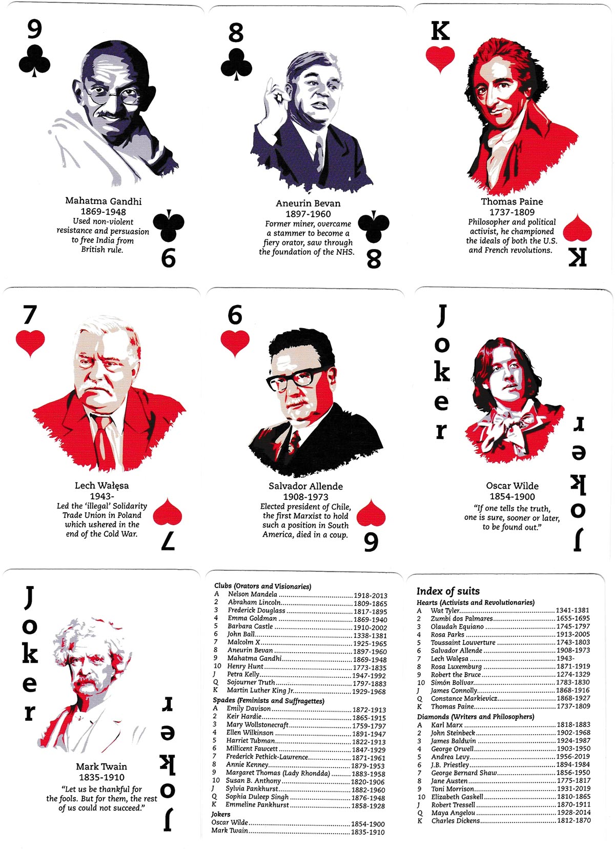 The pack identifies “larger-than-life” radical characters from history divided into four categories. Diamonds – writers and philosophers; clubs – orators and visionaries; hearts – activists and revolutionaries; spades – feminists and suffragettes. The jokers present words of wisdom from Oscar Wilde and Mark Twain. There are two extra cards which list the names of all portrayed with their dates of birth and death.