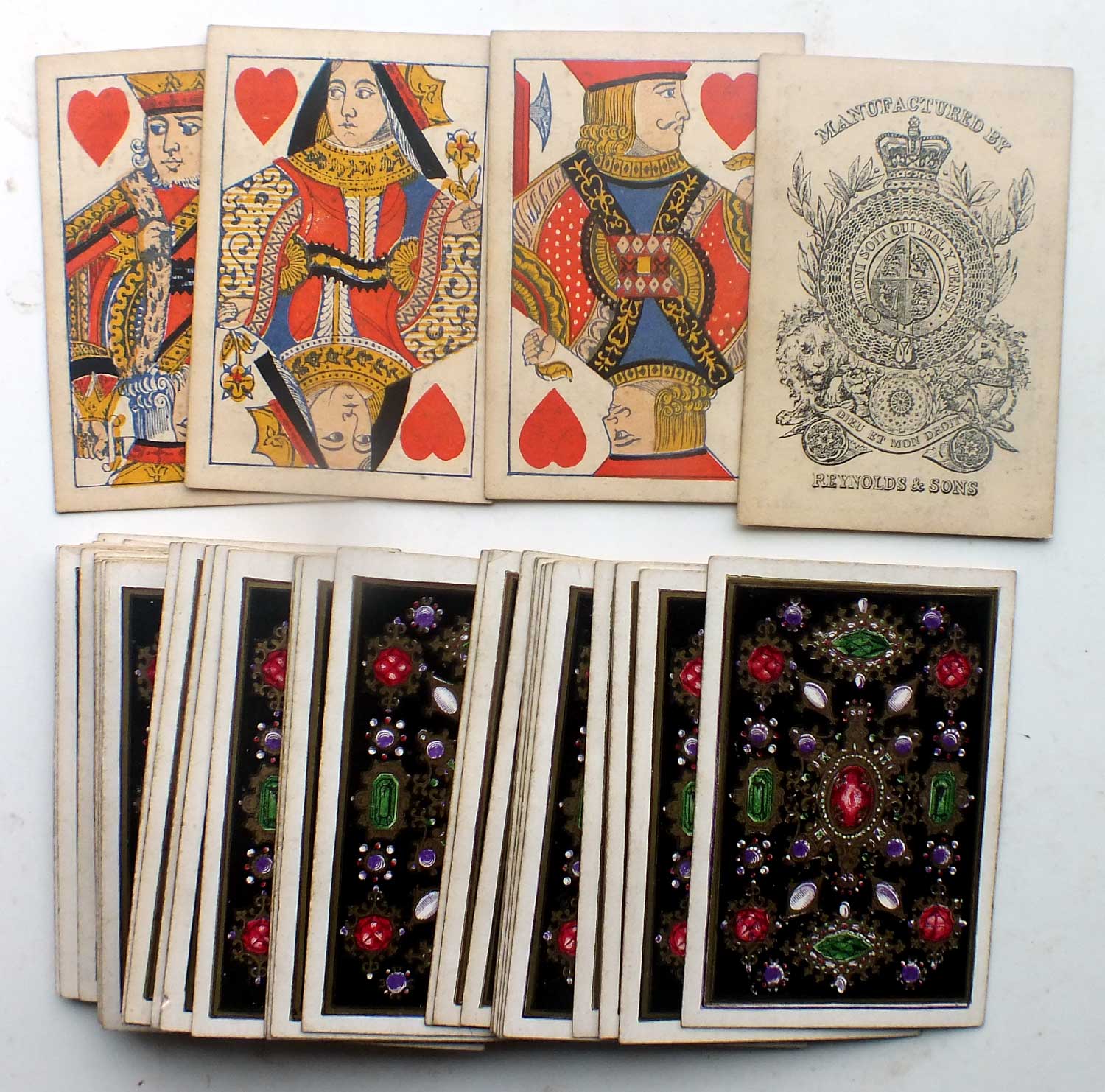 Reynolds & Sons, like several other UK manufacturers of the time, modernised the traditional court card designs in around 1840 with an overlay of decorative engraved patterns. Joseph Reynolds had been producing playing cards in the traditional method since c.1809 (click here to see) but new technologies facilitated a move away from woodblocks and in turn prompted changes in fashion and taste so that manufacturers began experimenting with new, 'modernised' designs (see also: Hunt and Sons, Bancks Brothers, De La Rue, Goodall & Son). The trend was subsequently imitated by foreign manufacturers (e.g. Boisse). Reynolds also produced a double-ended version of their new designs (shown below) as double-ended playing cards were becoming accepted at this time.