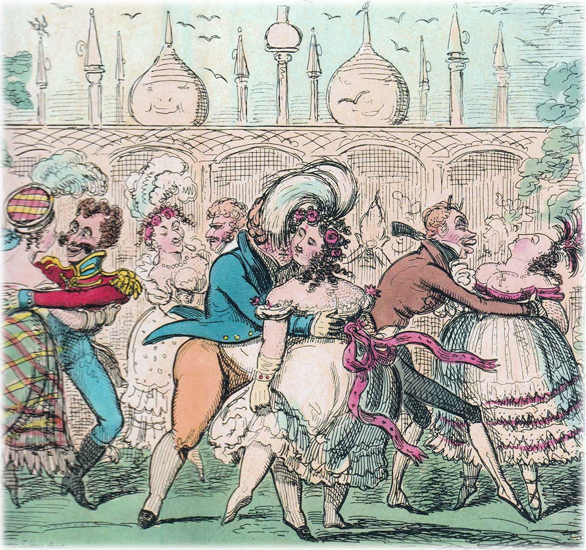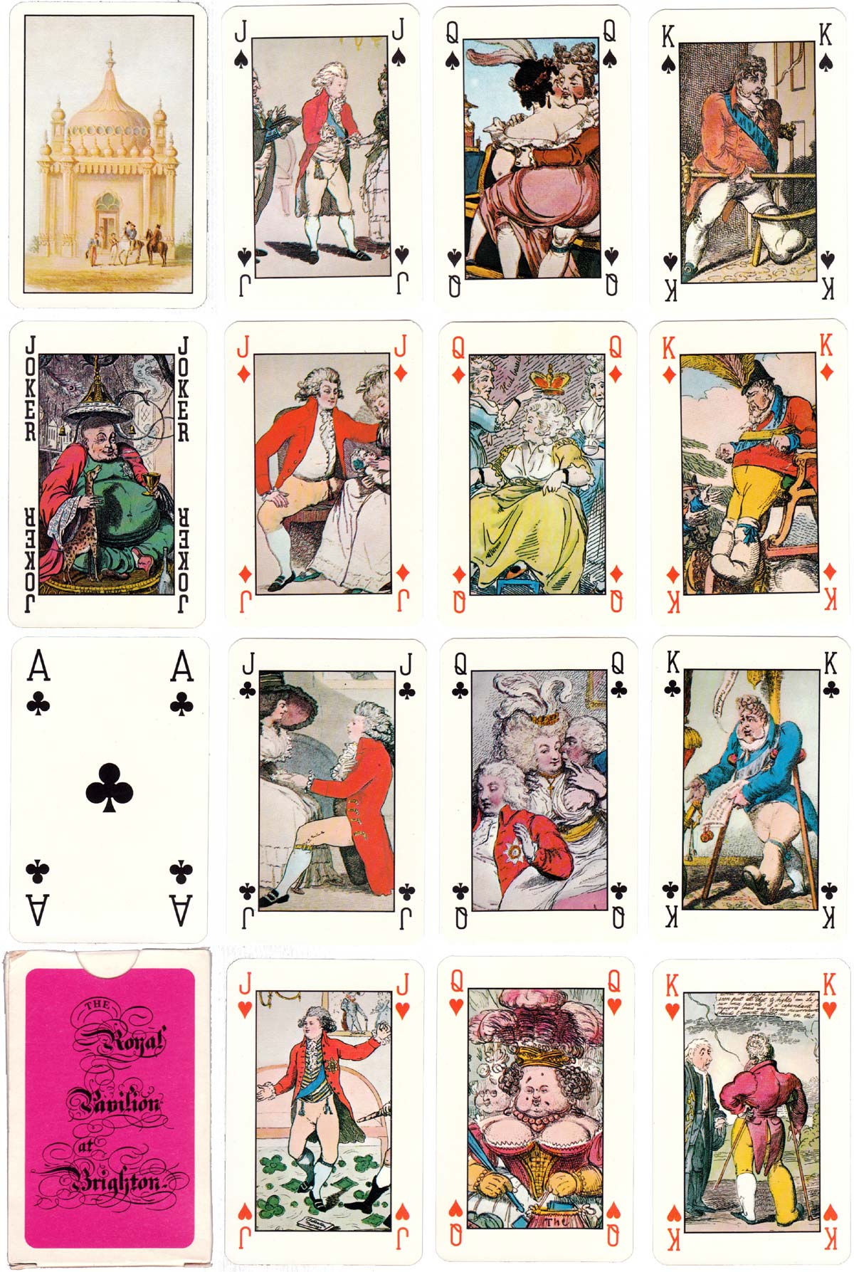 The “Royal Pavilion at Brighton” playing cards, depicting caricatures of Regency period life, is also known as the “Regency Deck”. The Royal Pavilion is a former royal residence located in Brighton, England. It was built in three stages, beginning in 1787, as a seaside pleasure retreat for George, Prince of Wales (from 1811 Prince Regent), in an opulent Indian style with extravagant chinoiserie interiors.