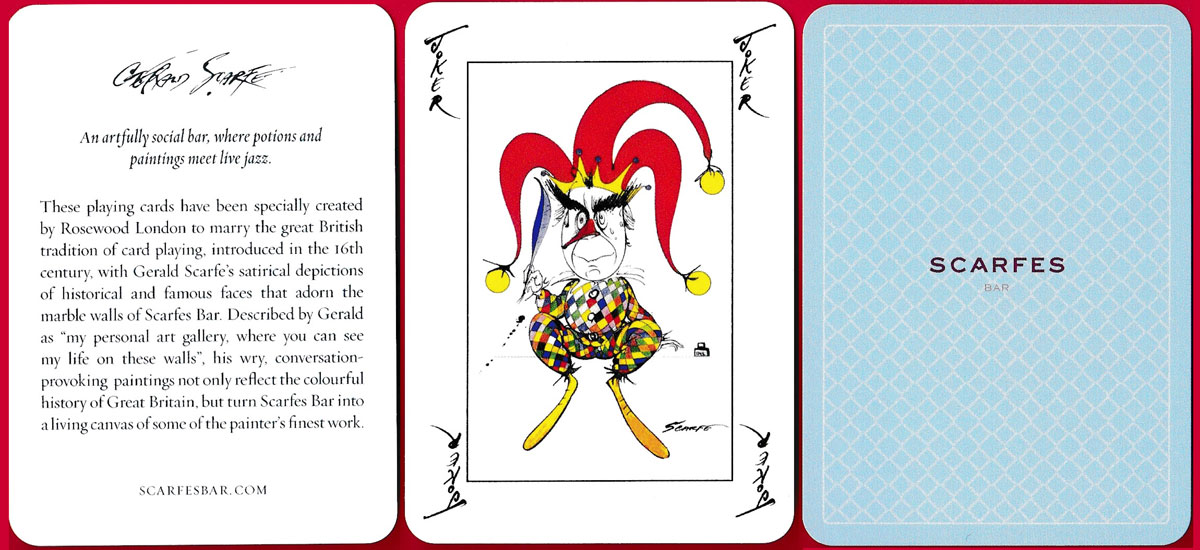 This undated pack, specially created by Rosewood London has 4 corner indices, and consists of 52 cards on each of which is a satirical, often cruel, depiction of a well-known individual from different walks of life -- British and European politicians, royalty, celebrities, musicians, actors and other prominent individuals. The 3 jokers depict Scarfe himself. See the box►