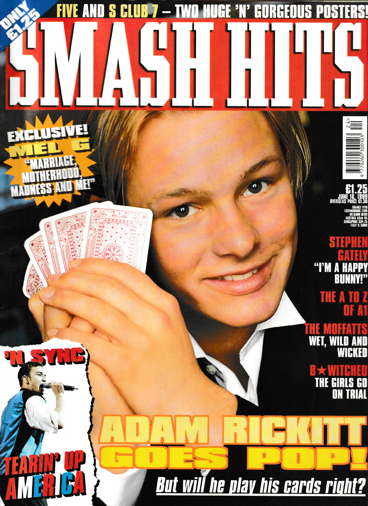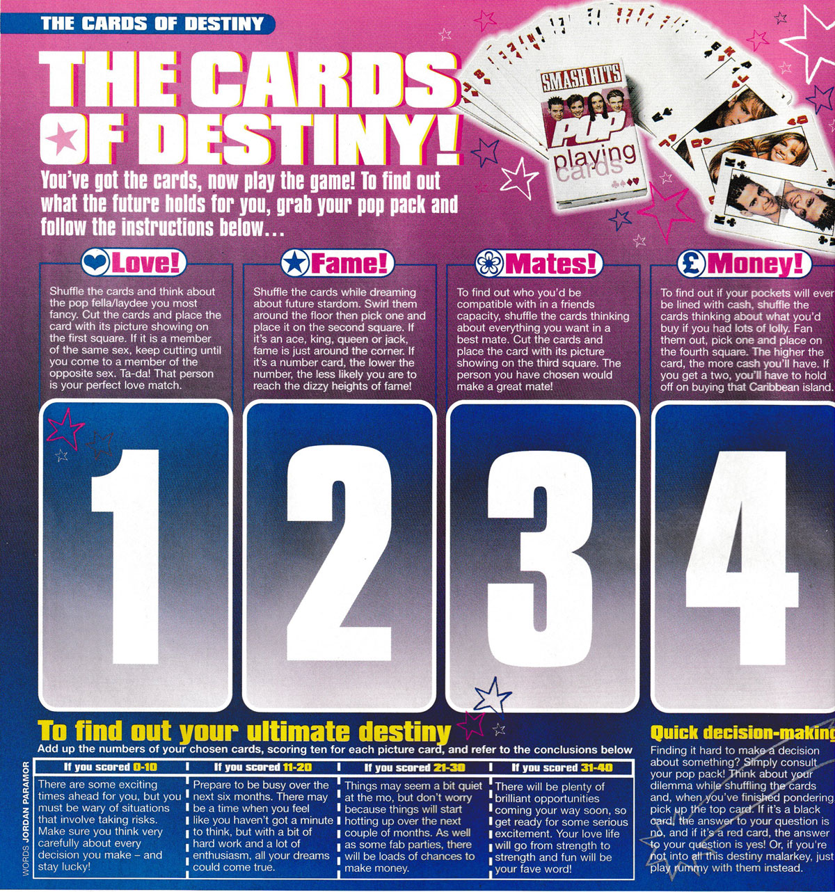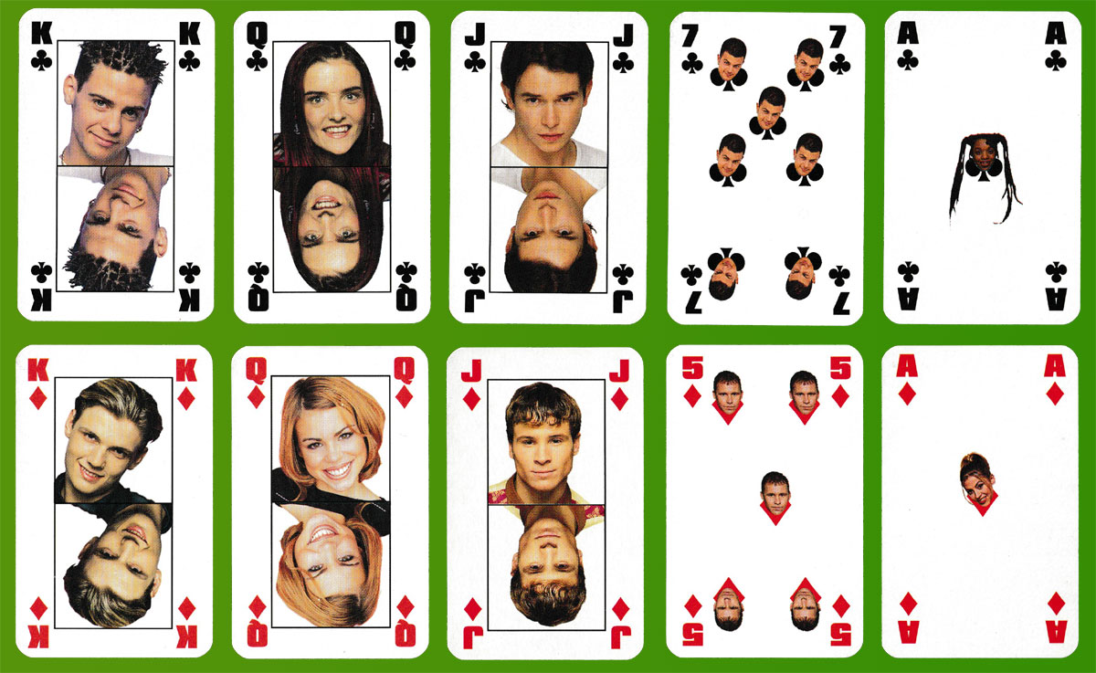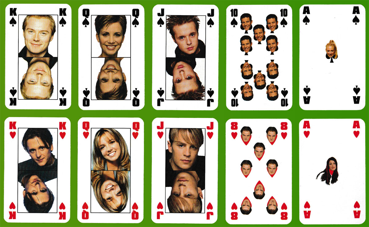 Smash Hits was a British music magazine which ran from 1978 to 2006. In their issue of 16 June 1999 they offered as a free gift this set of smaller than usual playing cards featuring different pop stars who were ‘big’ at the time. These include Adam Rickitt, Will Smith, Ronan Keating, Kylie Minogue, and Robbie Williams. Heads of more stars are superimposed on the pips. Unfortunately, the stars are not named – will they all be remembered or recognised in years to come? Adam Rickitt, a former star of the TV soap Coronation Street, appears on the cover of the magazine and also in a 3-page spread inside. On another page there are instructions for telling fortunes with the cards see more →