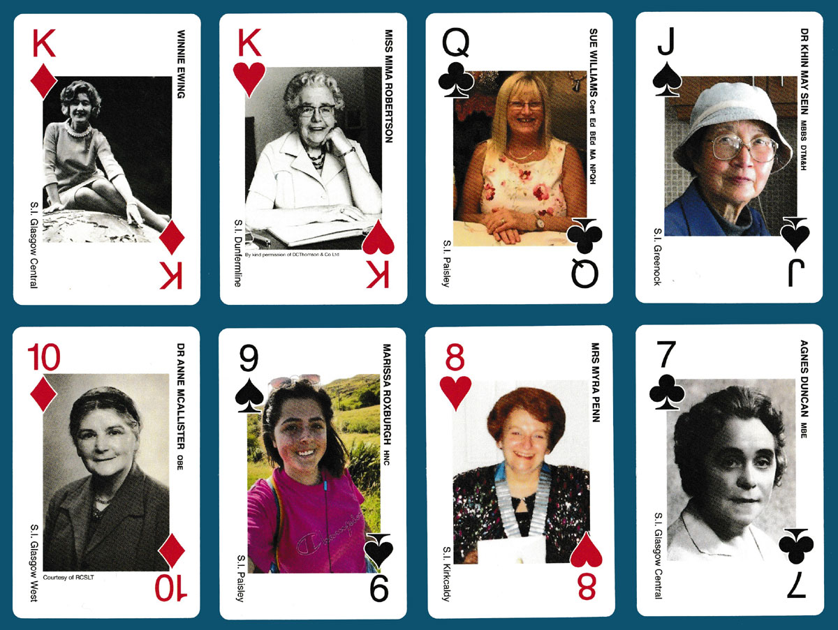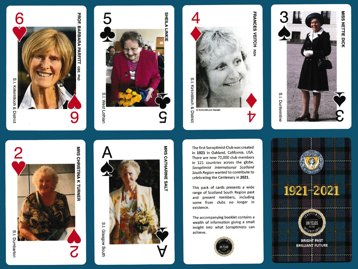 The first Soroptimist Club was created in Oakland, CA, USA, in 1921. Soroptimist International is a volunteer service organisation for women who work for peace. The Scotland South Region decided to contribute to the celebrations of the centenary by producing a special pack of cards featuring 52 past and present members, the most well-known perhaps being Winnie Ewing. Clearly it was thought inappropriate to put any of the members on the Jokers ……. so there are none! An extensive booklet accompanies the pack, providing a short biography of each Soroptimist depicted on the cards. See the box►