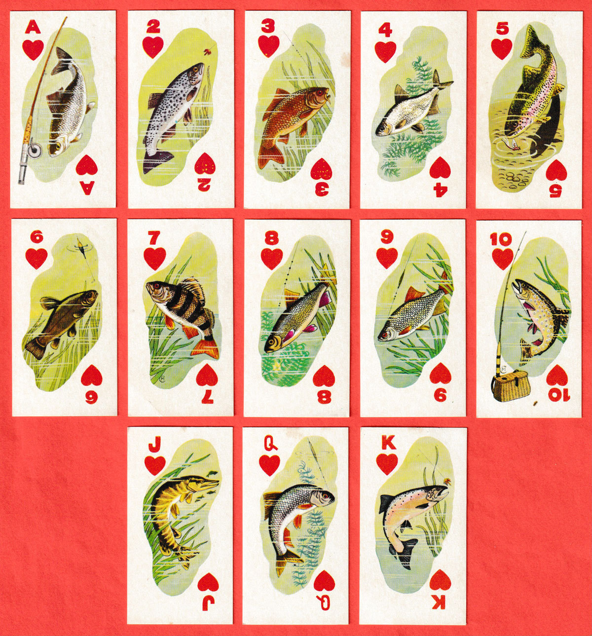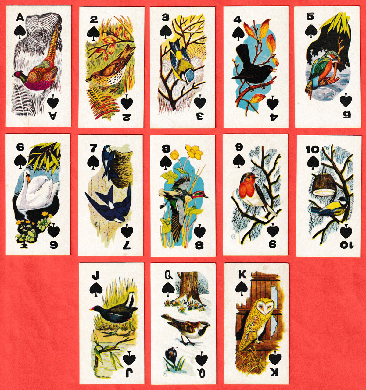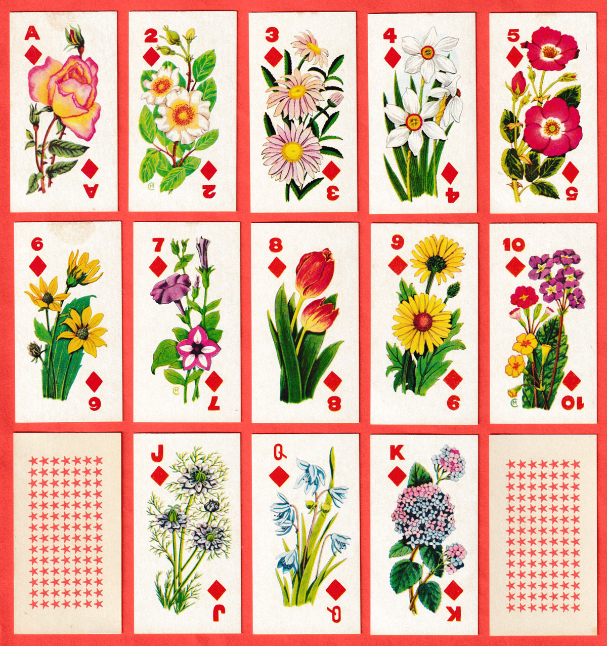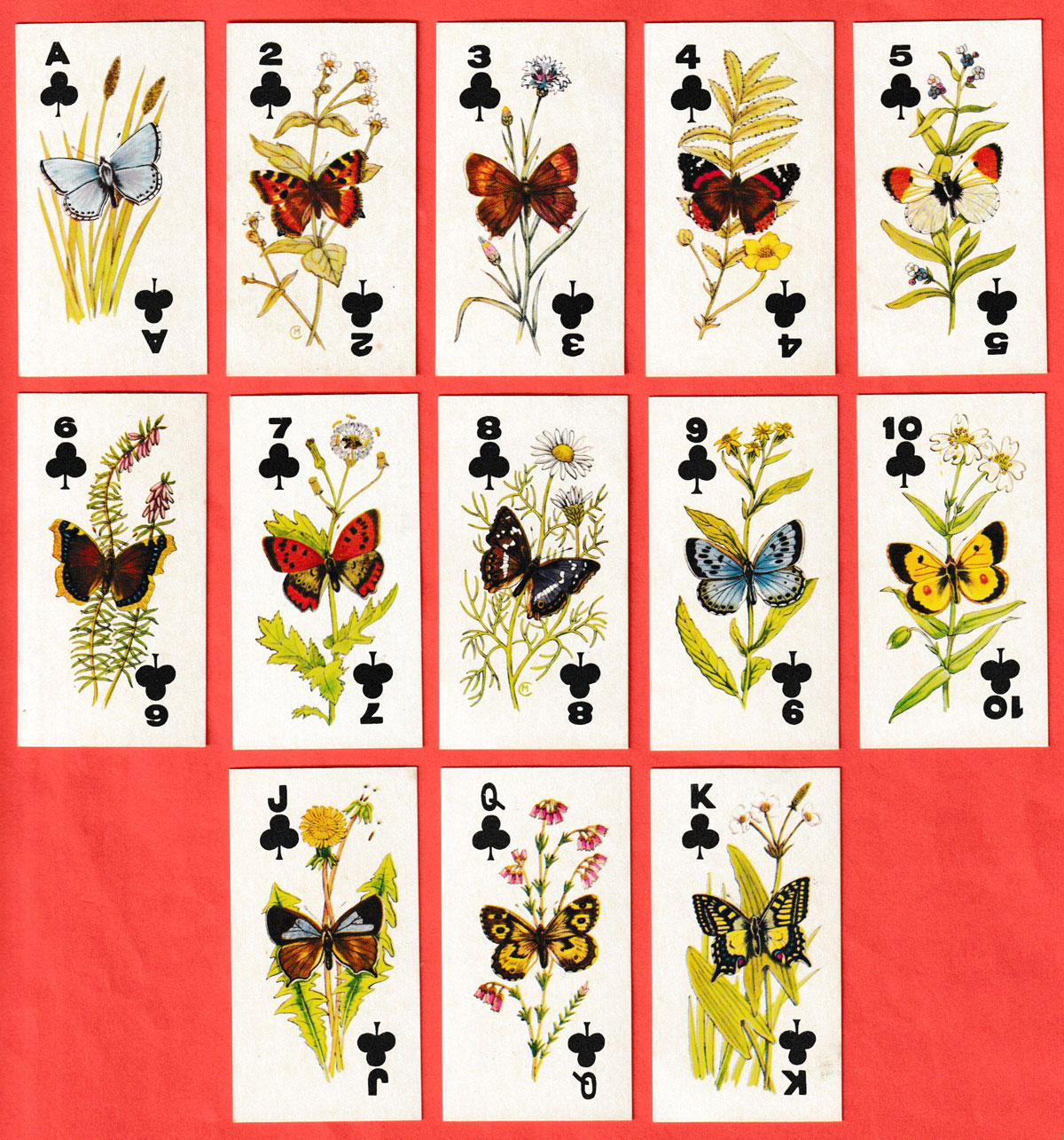 These delightful little cards were given away – one at a time – with packets of sweet cigarettes. The unnamed subjects are birds (S), fish (H), butterflies (C), and flowers (D). The cards have square corners. This set has no jokers. The pattern on the reverse is made up of 98 small stars in 14 rows of 7.
