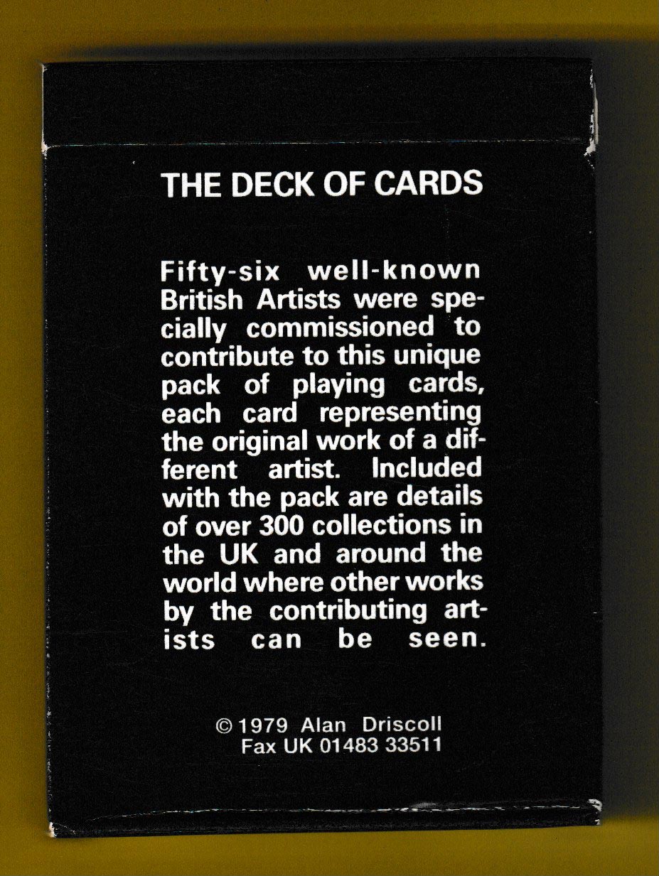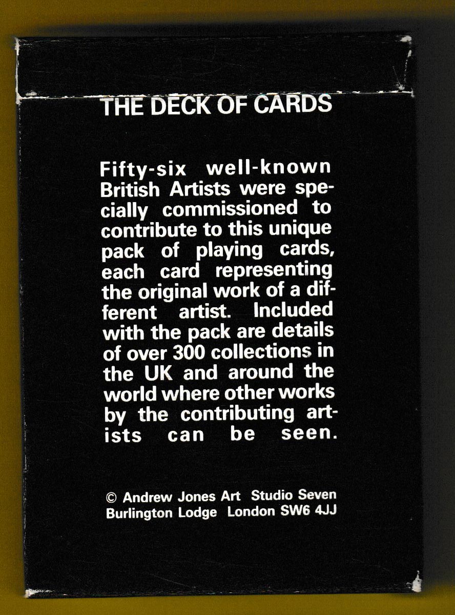 “In 1976 the JPL Gallery in London asked fifty four British artists to create their version of a playing card. Each artist was given the task to create a specific card from the pack; plus an artist to create the reverse pattern for the entire deck and an artwork for the pack itself. When collector Andrew Jones saw the show he purchased the entire collection and approached artists with the request to create an actual pack of cards from their artworks. The cards were then then sold in a range of outlets including gallery shops such as the RA. Some of the best known British artists from the 20th century were involved with this project including many RAs.”