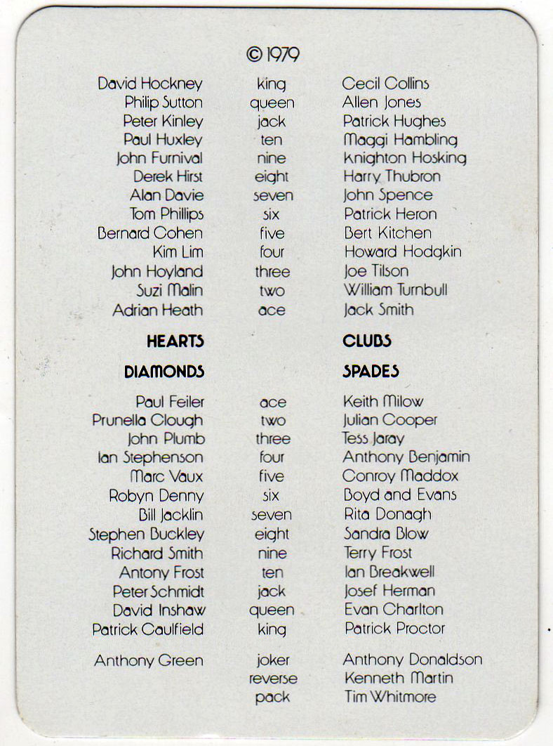 “The Deck of Cards” collaborative deck commissioned by the JPL Gallery of London, published by Andrew Jones Art, 1979. Not necessarily easy to play with, but according to the Royal Academy of Arts: